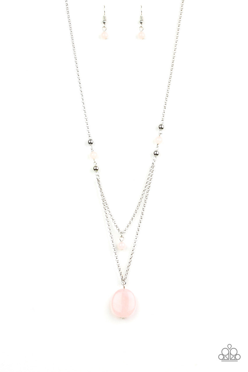 Rows of dainty silver and glassy pink beads give way to two shimmery silver chain layers. A dainty pink bead swings from the uppermost strand, while a glassy pink stone pendant swings from the lowermost chain for a stacked look. Features an adjustable clasp closure.