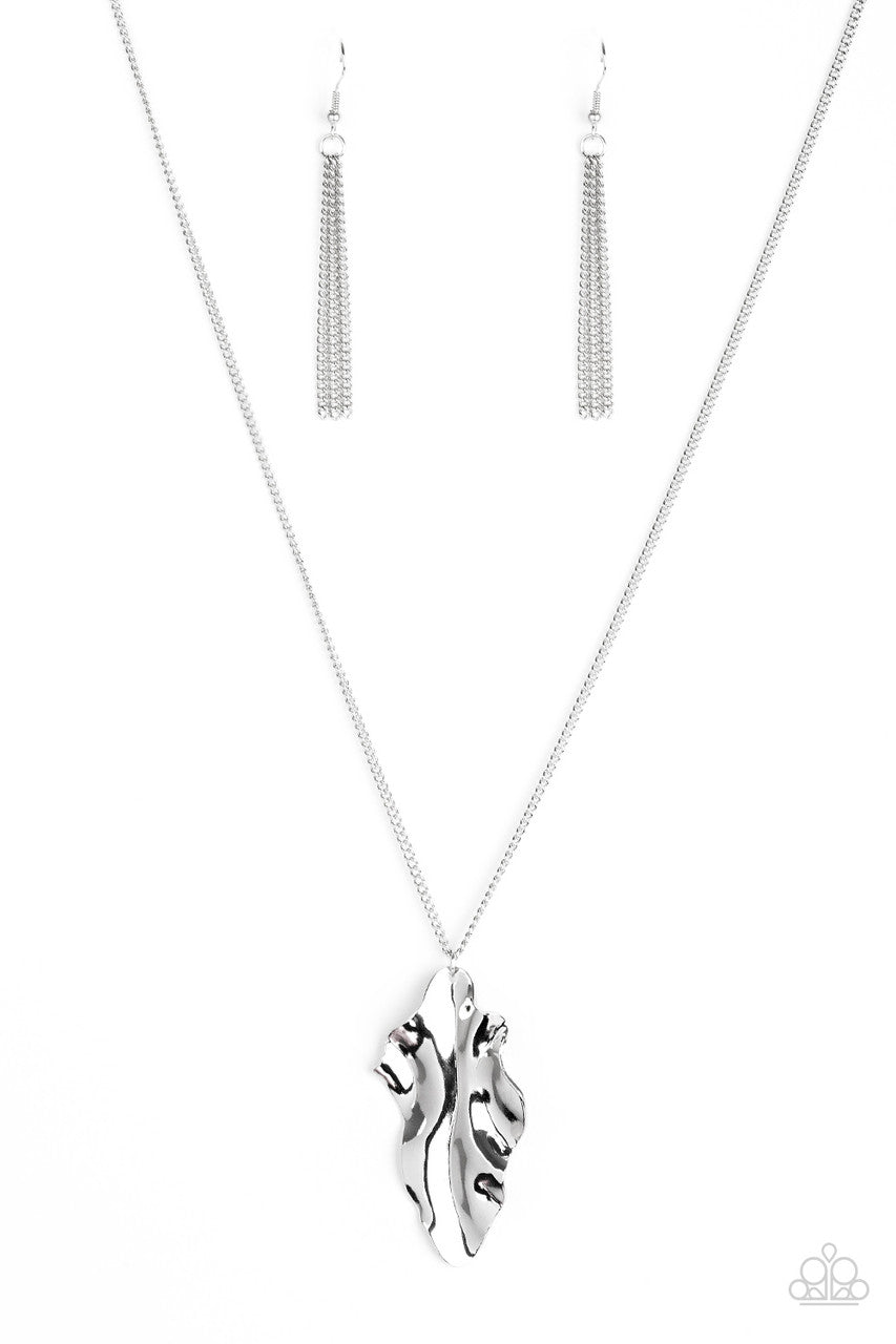 An elongated silver chain gives way to a rippling silver leaf-like pendant for a seasonal look. Features an adjustable clasp closure.