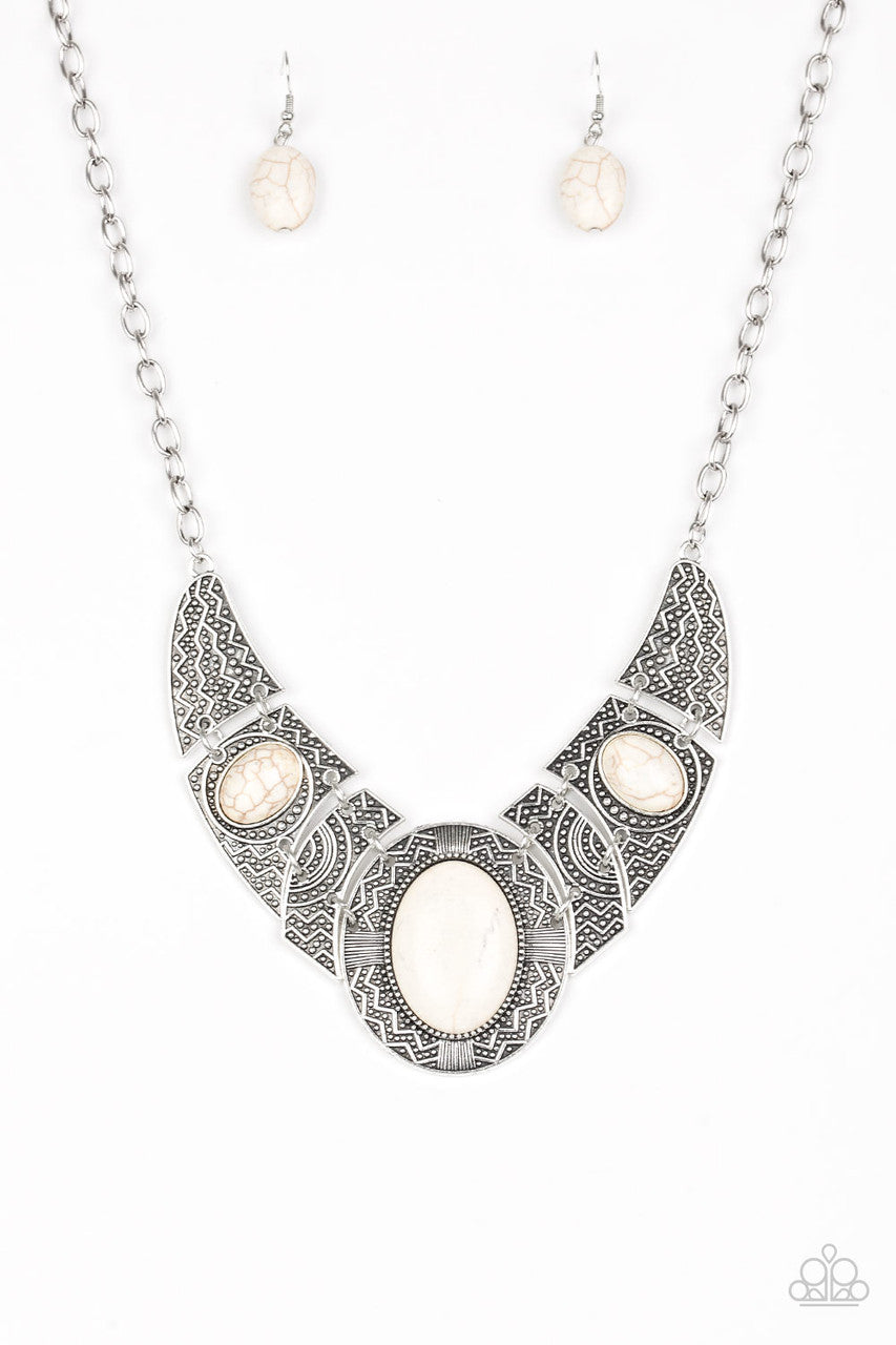 Radiating with studded and tribal inspired patterns, antiqued silver plates connect below the collar for a fierce look. Refreshing white stones are pressed into the plates, adding an artisan flair to the dramatic centerpiece. Features an adjustable clasp closure.