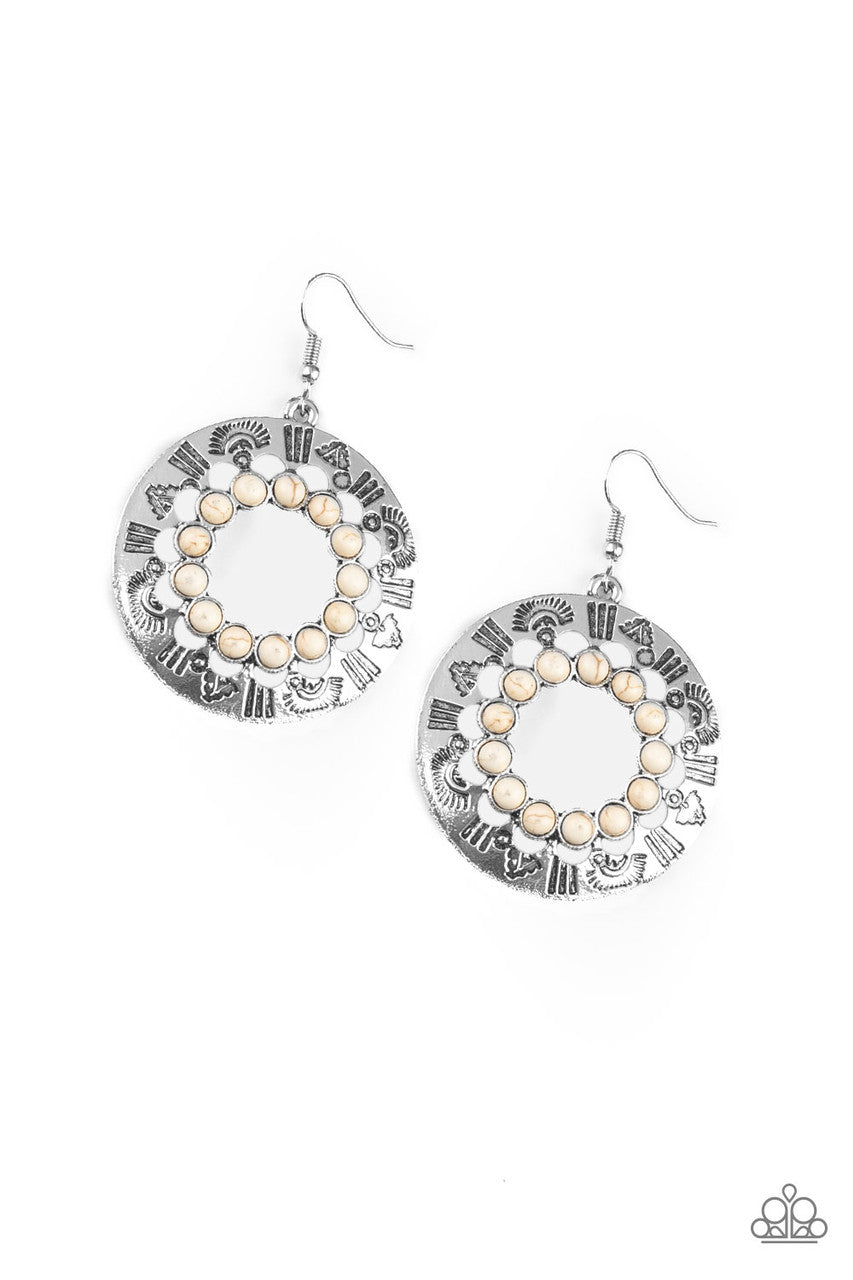 Refreshing white stones spin around the center of a shimmery silver hoop stamped in tribal inspired patterns for a seasonal look. Earring attaches to a standard fishhook fitting.