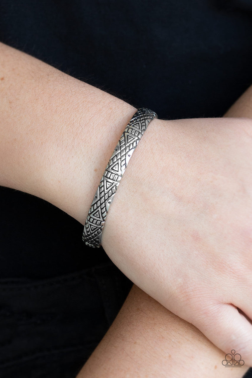 Stamped in geometrical tribal patterns, a dainty silver cuff curls around the wrist for a seasonal look.