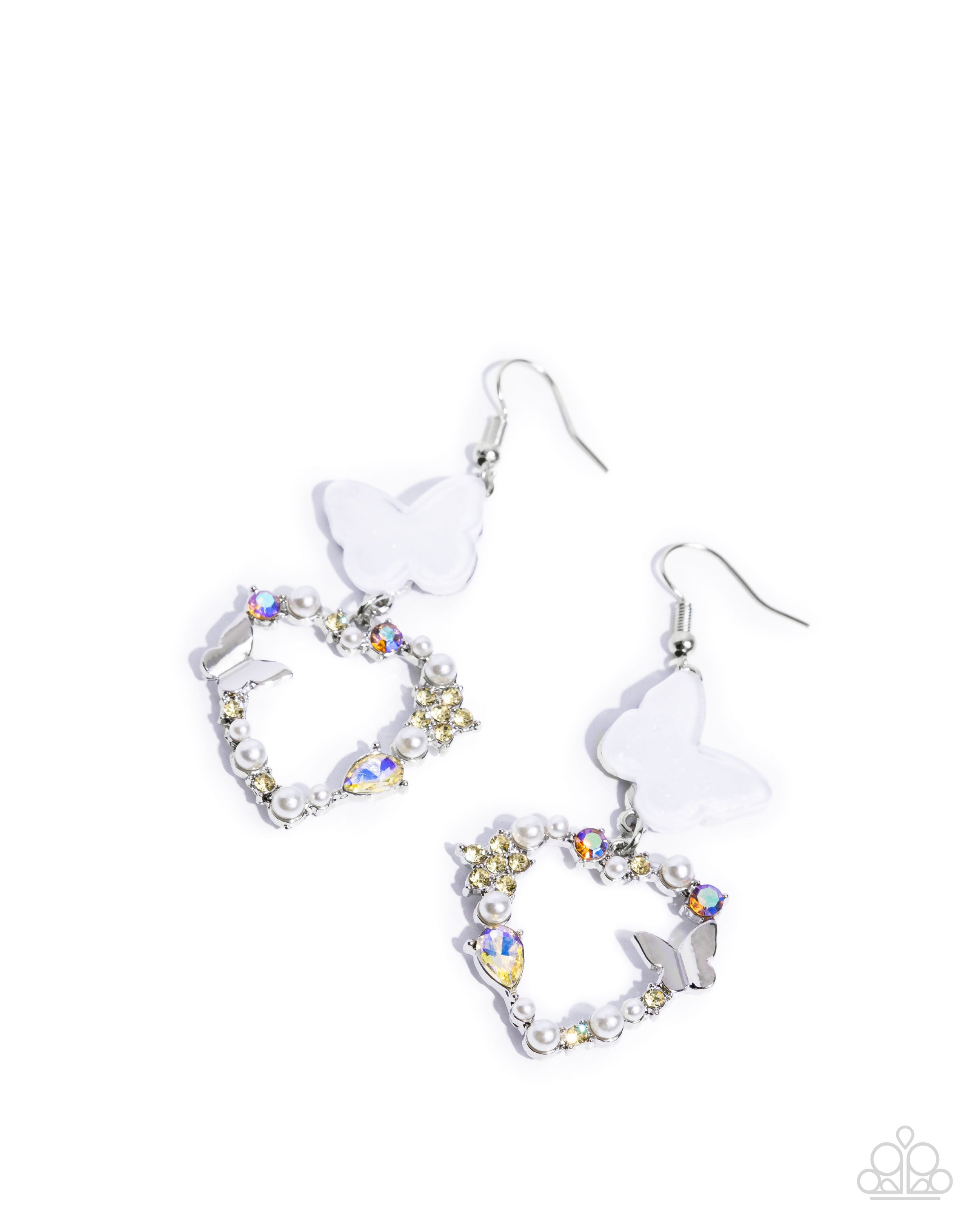 Dusted in glitter, a white tilted butterfly gives way to a silver heart dusted with white pearls, yellow rhinestones, yellow iridescent rhinestones, a yellow teardrop gem, a silver butterfly, and a yellow rhinestone flower for a whimsically wondrous lure. Earring attaches to a standard fishhook fitting. Due to its prismatic palette, color may vary.