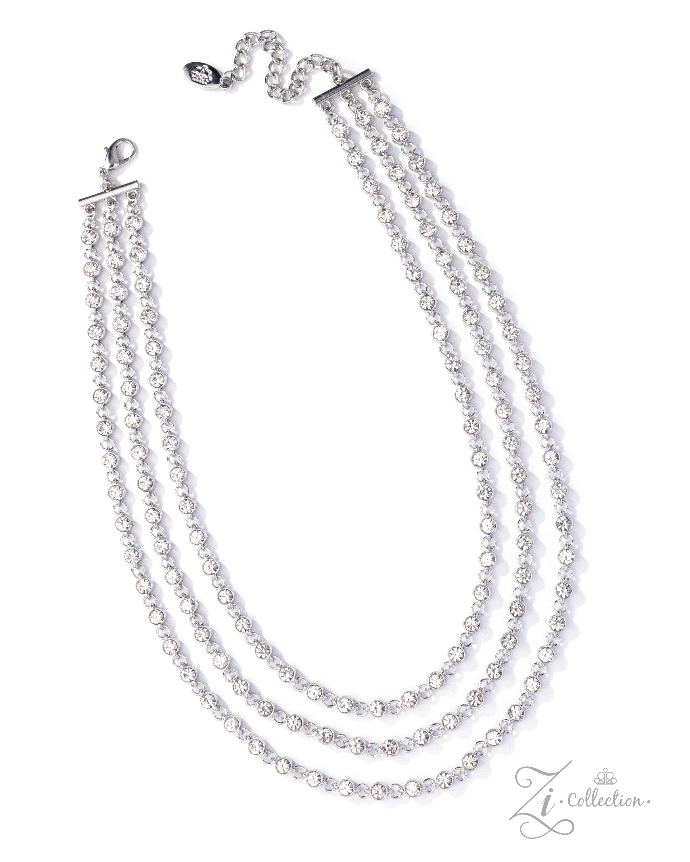 Three rows of delicately stacked white rhinestones ripple with blinding brilliance as they dance along the collar. Encased in sleek silver fittings, the dainty gems create layers of refined sparkle, proving that power doesnât always come in sizeâit shines in unapologetic luxury in every light-reflecting glint. Features an adjustable clasp closure.