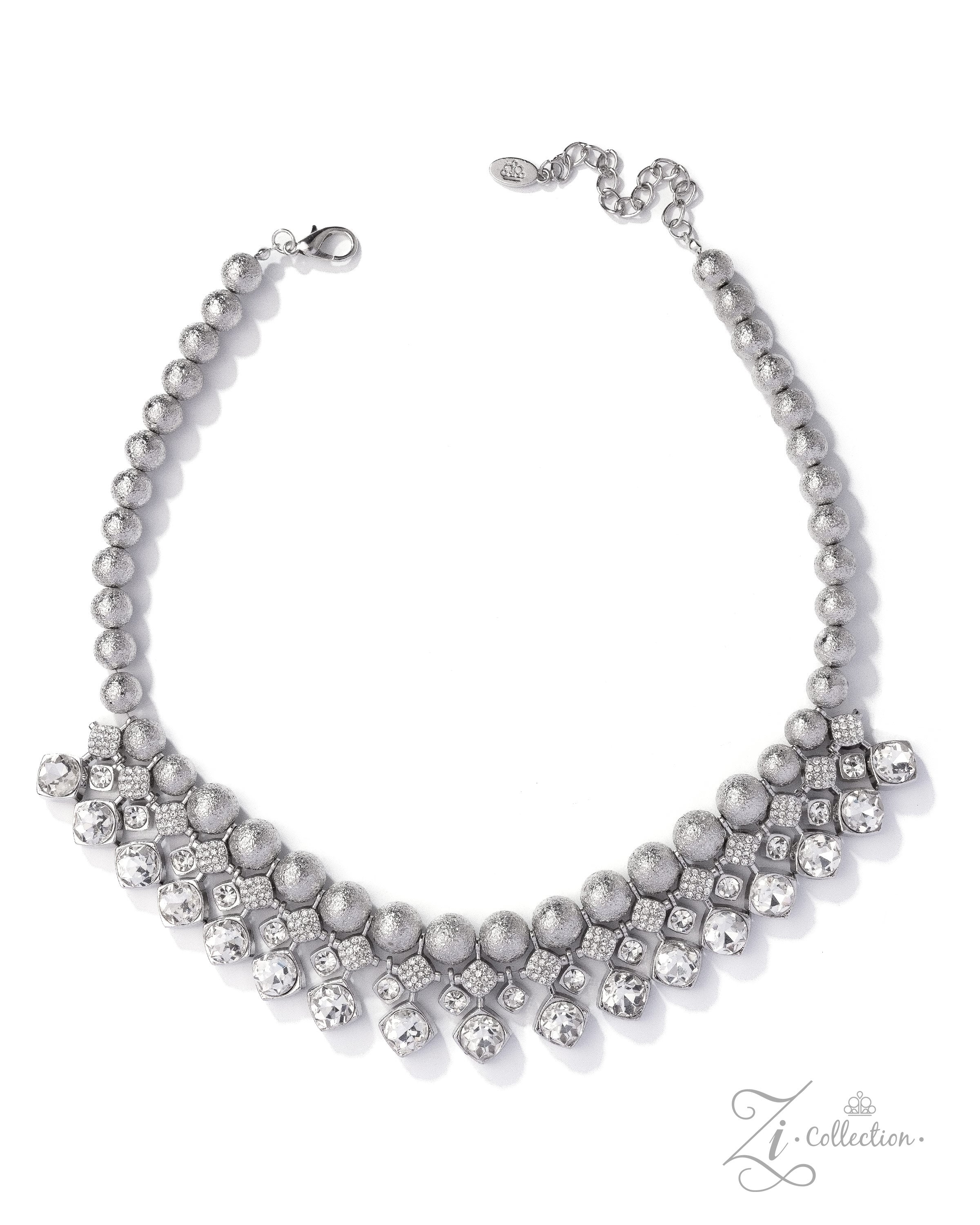 Infused along an invisible wire, a refined strand of subtly textured silver spheres gradually increases in size as they radiate toward the center of the chest in a sleek display of modern sophistication. Below, layers of slender silver wires erupt into a glittering cascade of brillianceâstaggered diamond-shaped frames dusted in white rhinestones give way to oversized white gems that drip with unapologetic drama. Intermixed with delicate solitaire gems in minimalist silver frames, each luminous element links across the neckline, building into a sensational statement piece that demands a double-take. Features an adjustable clasp closure.