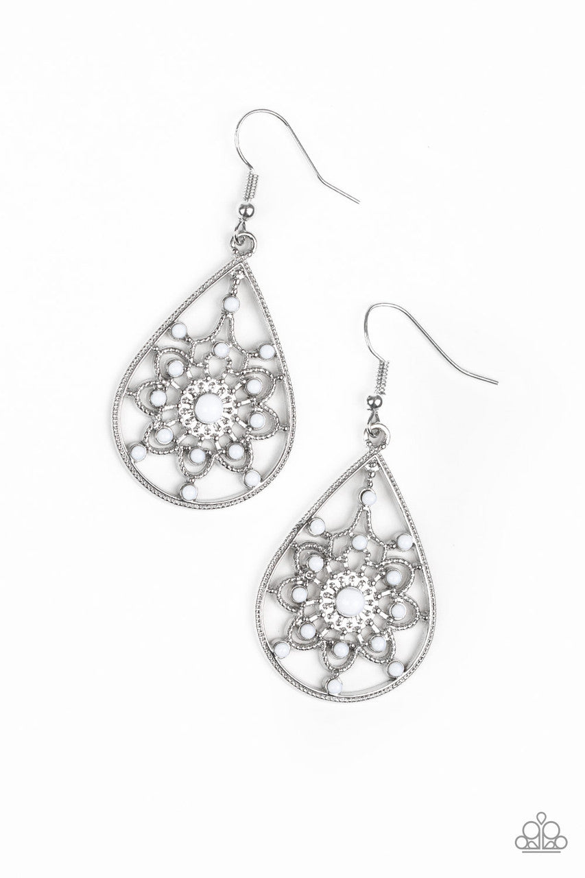 Dainty white beads are sprinkled across the front of a shimmery silver teardrop frame radiating with floral patterned filigree for a whimsical look. Earring attaches to a standard fishhook fitting.