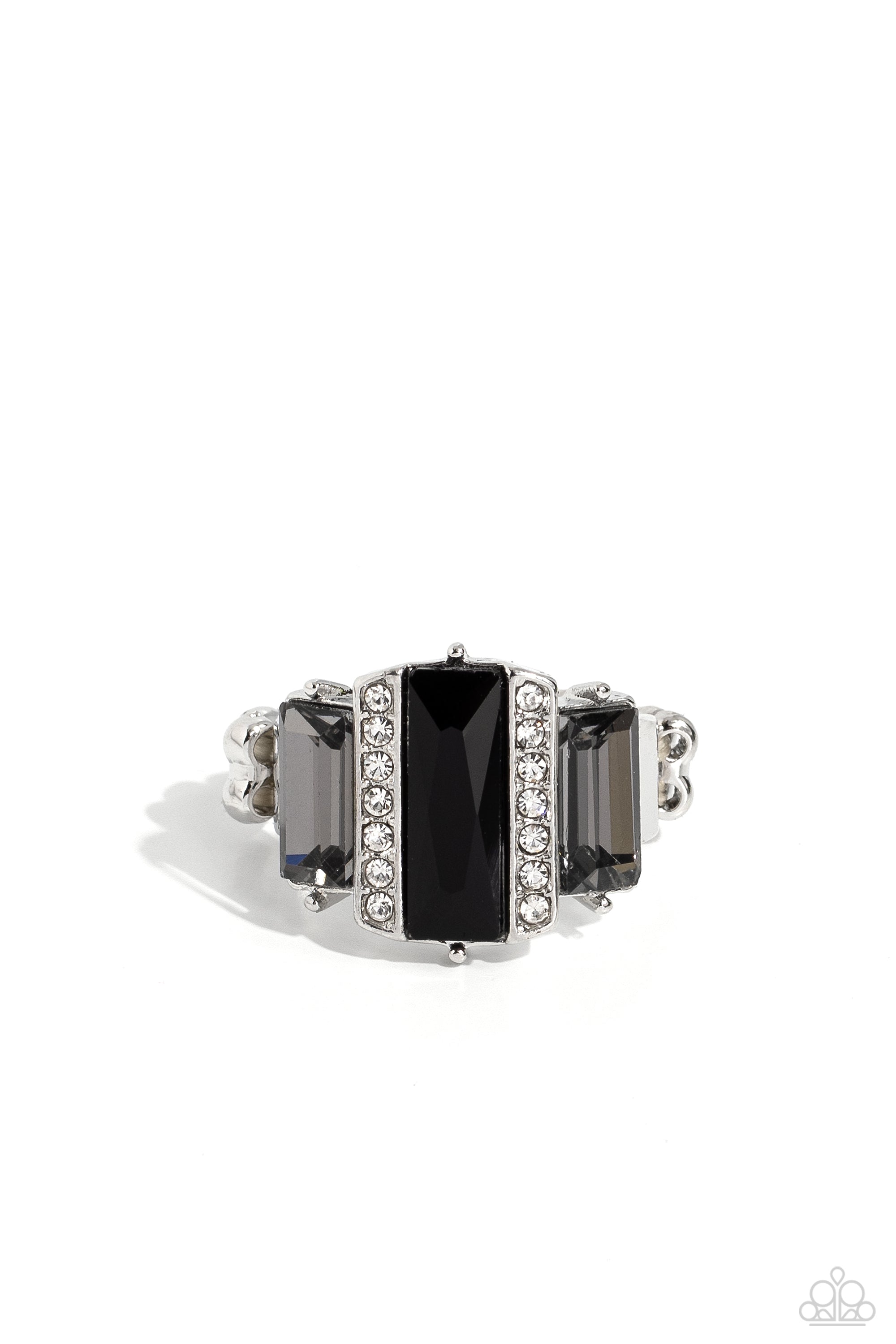 Bordered by two rows of dainty white rhinestones, an emerald cut black rhinestone adorns the center of a band dotted with a pair of smoky emerald cut rhinestones, resulting into a jaw-dropping dazzle across the finger. Features a stretchy band for a flexible fit.