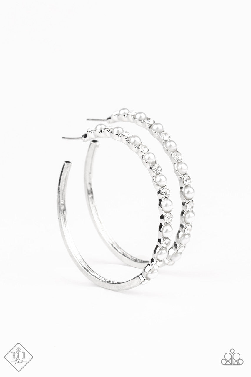 The front edge of a glistening silver hoop is decorated in a refined collection of tiny white pearls and glassy white rhinestones for a sophisticated finish. Earring attaches to a standard post fitting. Hoop measures approximately 2" in diameter.