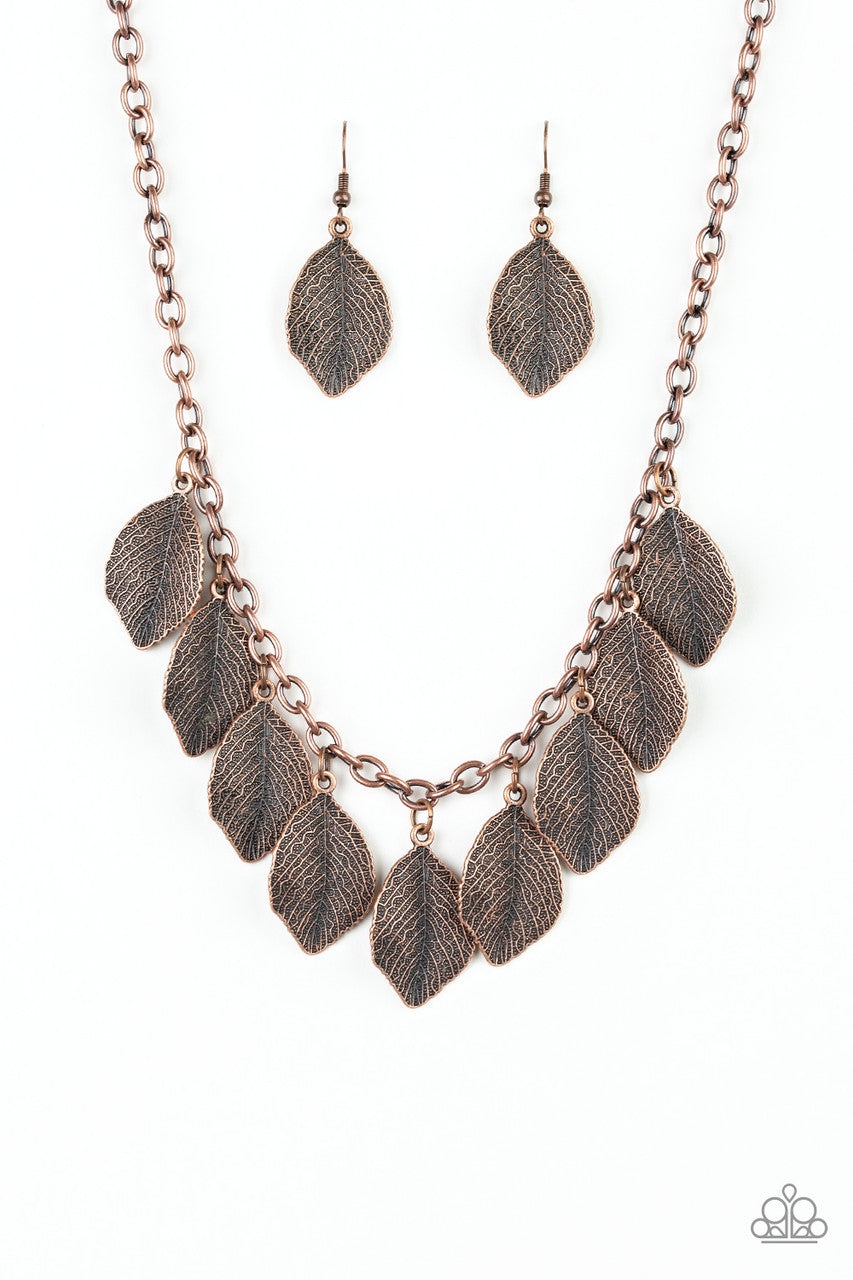 Embossed in lifelike textures, antiqued copper leaves swing from the bottom of a glistening copper chain, creating a seasonal fringe below the collar. Features an adjustable clasp closure.