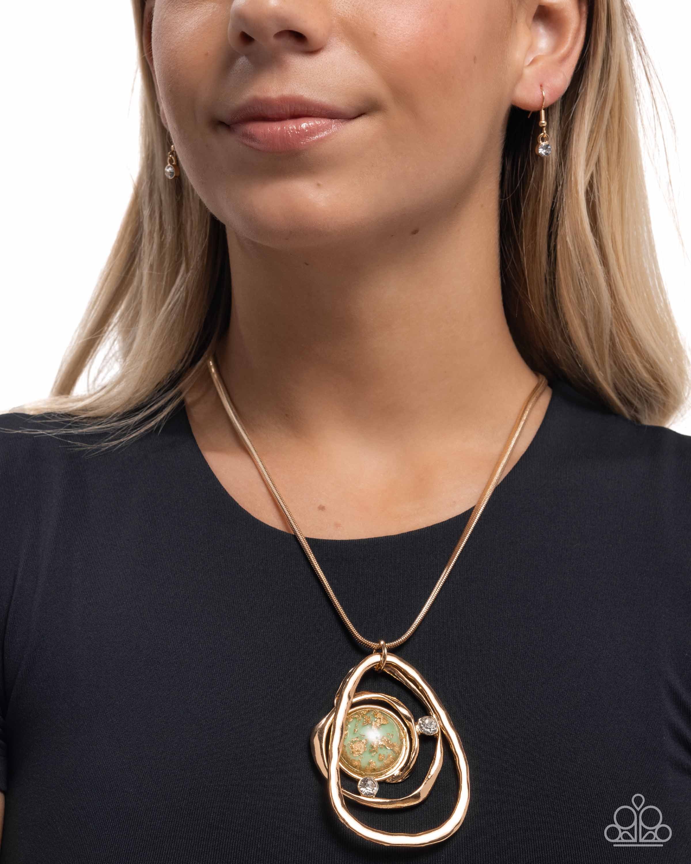Flecked in gold foil, a light green bead centered amidst abstract concentric gold frames delicately links below the collar for a dash of refined shimmer. Solitaire white rhinestones peek out and shimmer amidst the frames for additional radiance. Features an adjustable clasp closure.