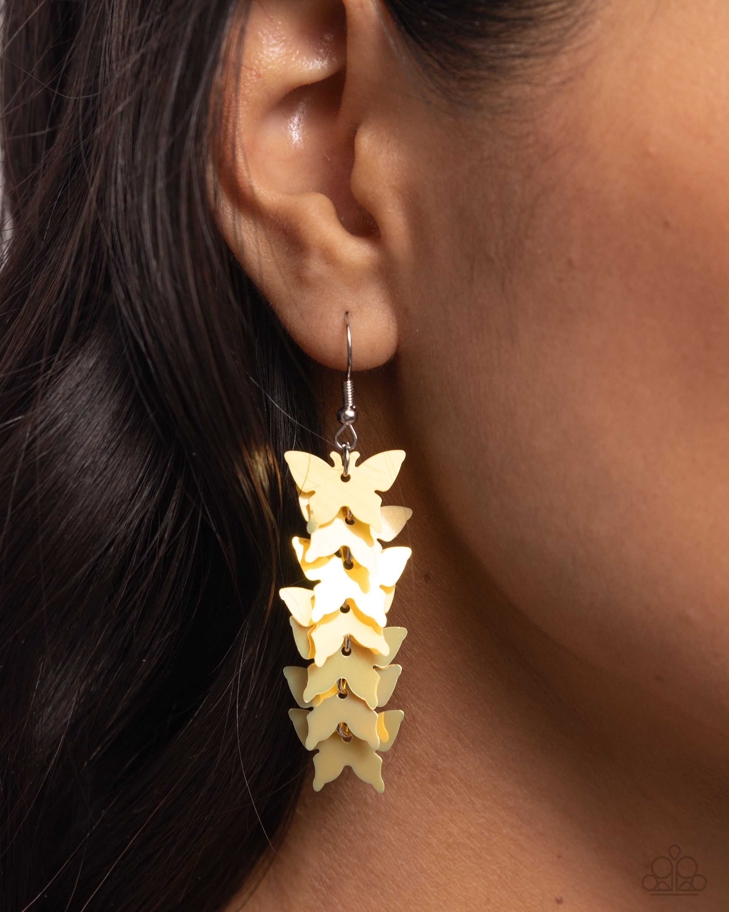 Featuring a reflective sheen, yellow multicolored butterflies cascade down the ear in layers for a whimsically wondrous display. Earring attaches to a standard fishhook fitting.