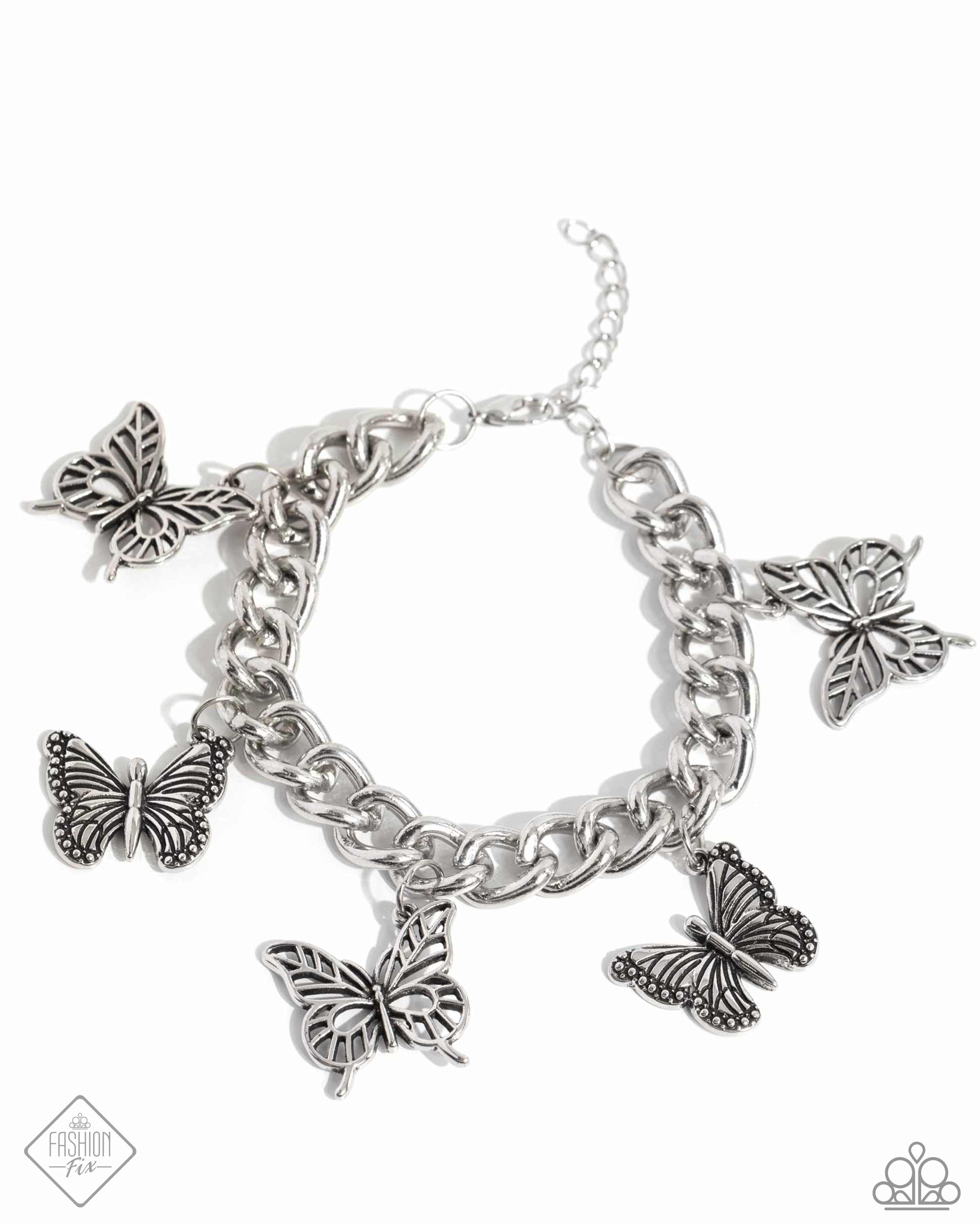 Fluttering along a high-sheen silver curb chain, a collection of silver butterflies, one featuring airy details, the other, studded textures, alternate along the wrist for a whimsical freestyle look. Features an adjustable clasp closure.