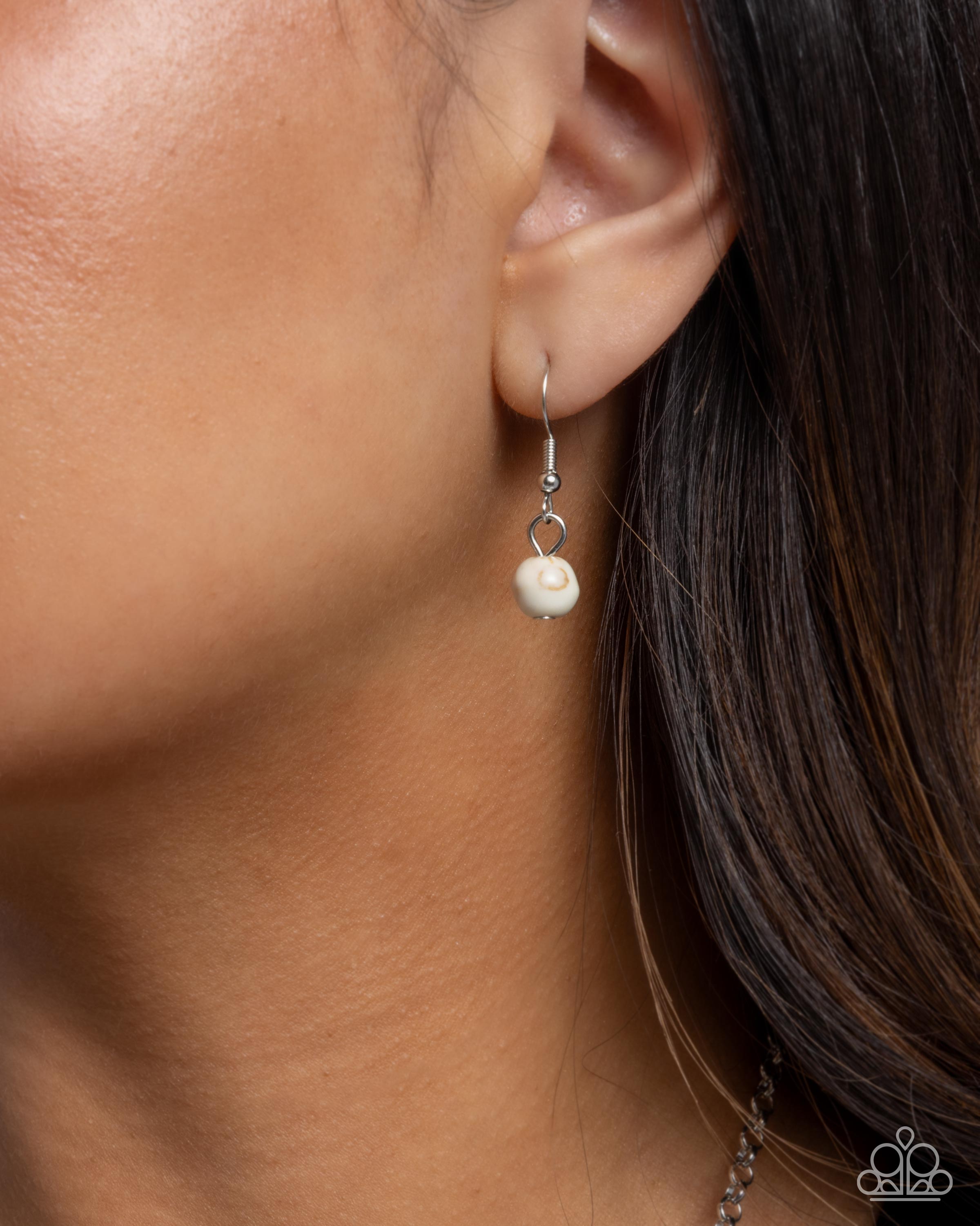 A collection of mismatched silver and white charms, including a compass, arrows, and white and turquoise stone beads, swings from the bottom of a chunky silver chain for a wanderlust-inspired look. A lobster clasp hangs from the bottom of the design to allow a name badge or other item to be attached. Features an adjustable clasp closure. As the stone elements in this piece are natural, some color variation is normal.