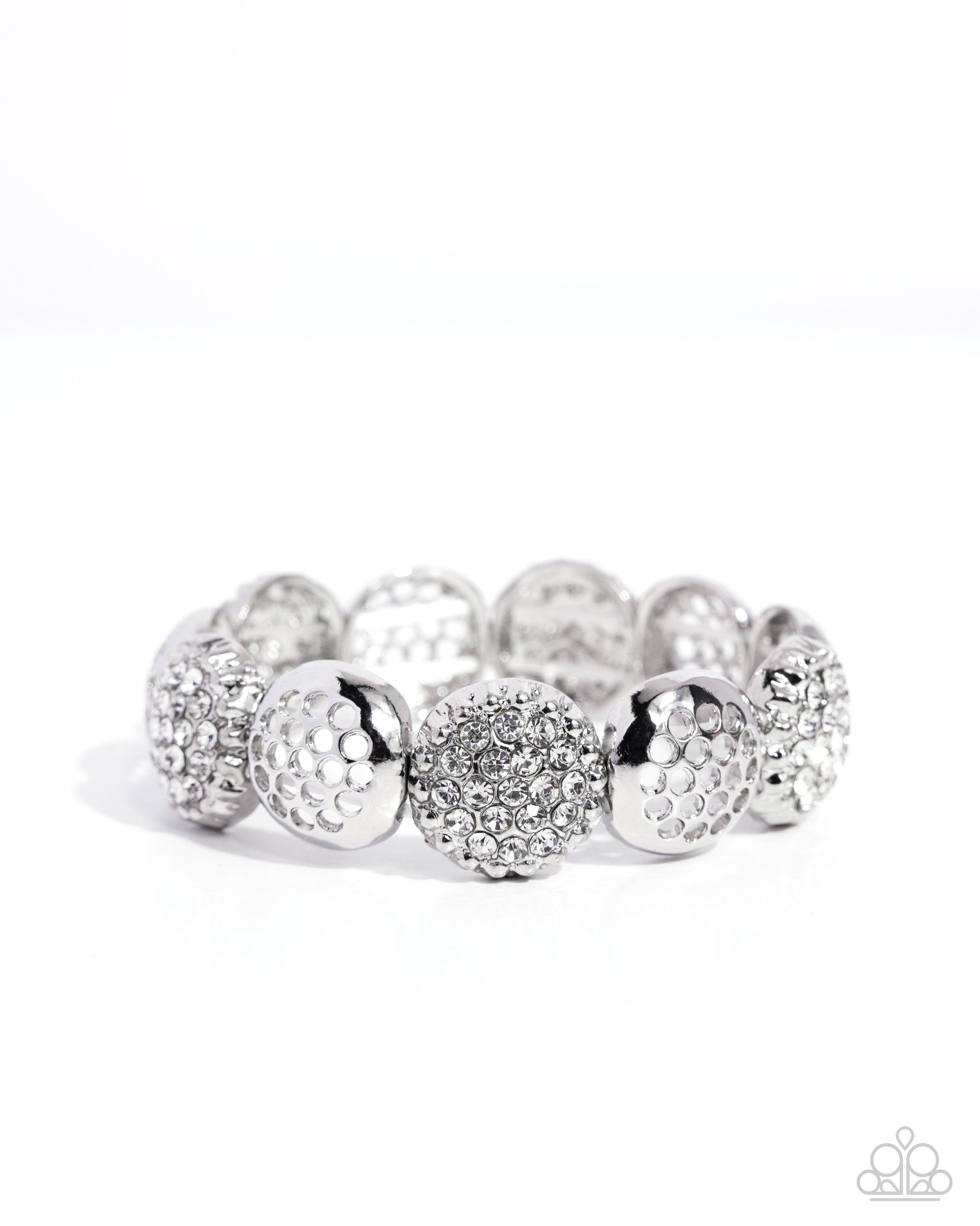 Infused along elastic stretchy bands, a rounded silver disc dotted with airy holes alternates with a hammered, rounded disc embellished in white rhinestones for a grungy glittery display.