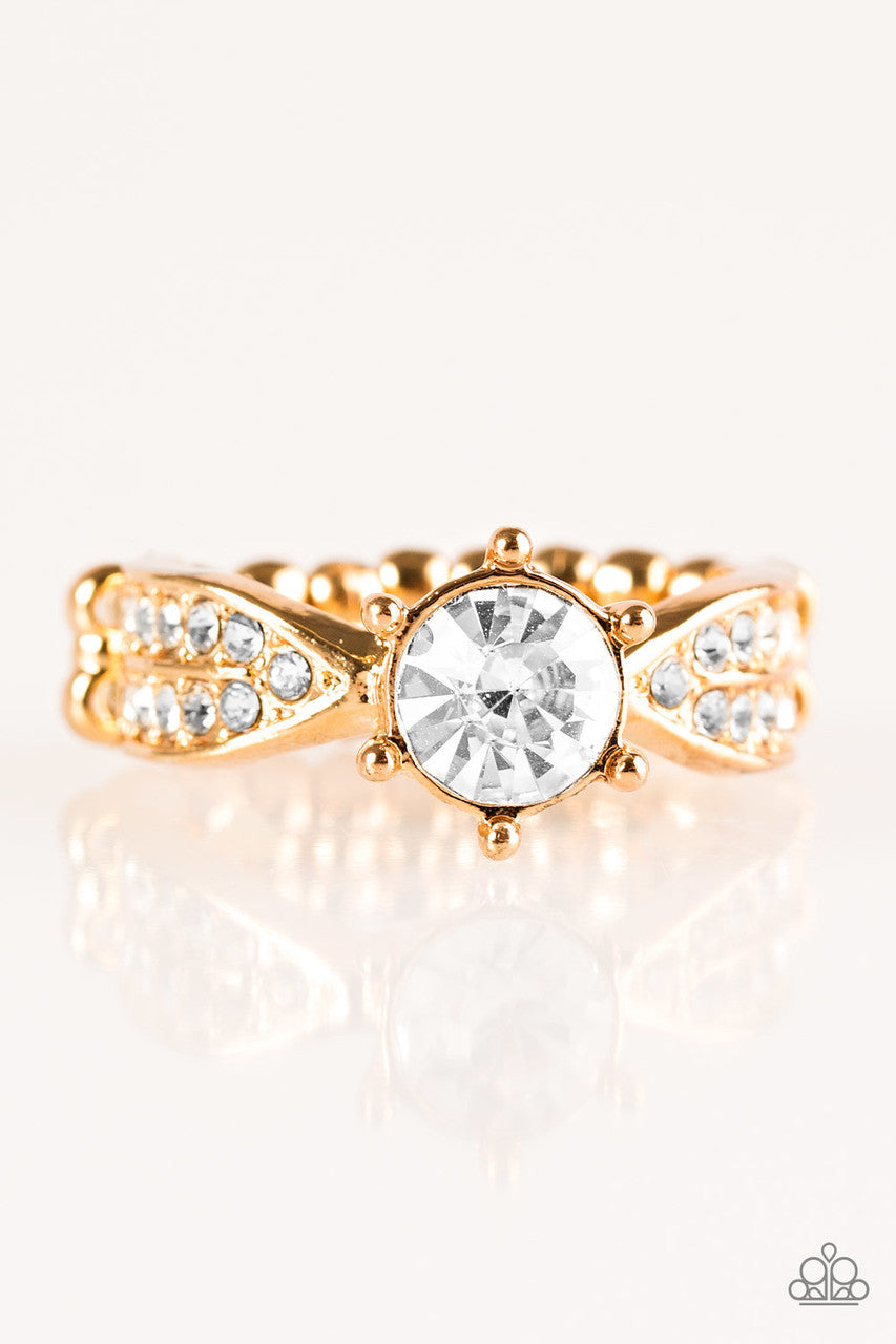 Encrusted in dazzling white rhinestones, glistening gold bands attach to a glittery white rhinestone centerpiece, for a regal finish. Features a dainty stretchy band for a flexible fit.