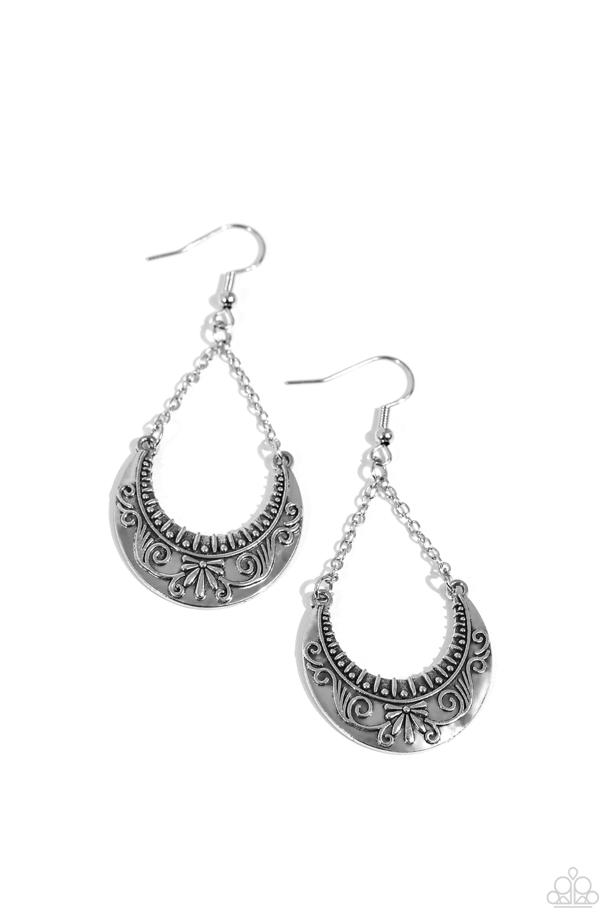 Embossed in studded and flowery filigree details, an antiqued half moon frame is suspended from two chains, creating a rustic chandelier. Earring attaches to a standard fishhook fitting.