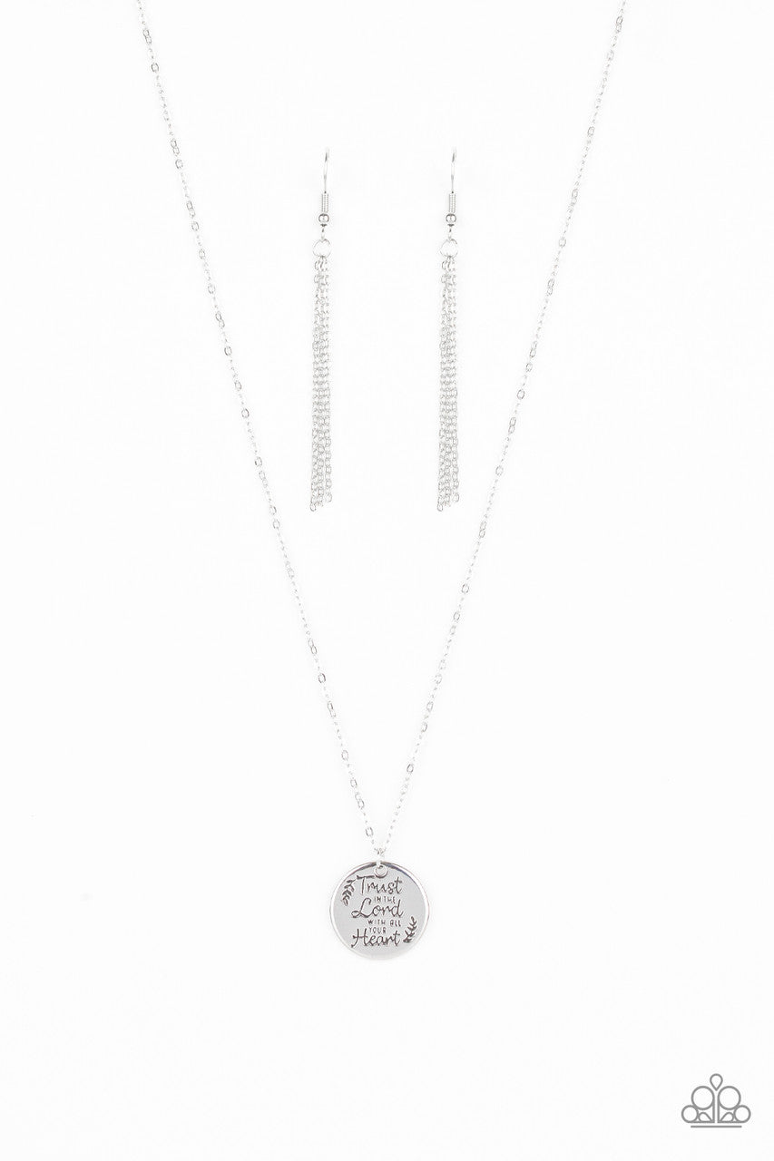 Infused with leafy accents, a dainty silver pendant is stamped in the inspirational phrase, "Trust In The Lord With All Your Heart". Features an adjustable clasp closure.