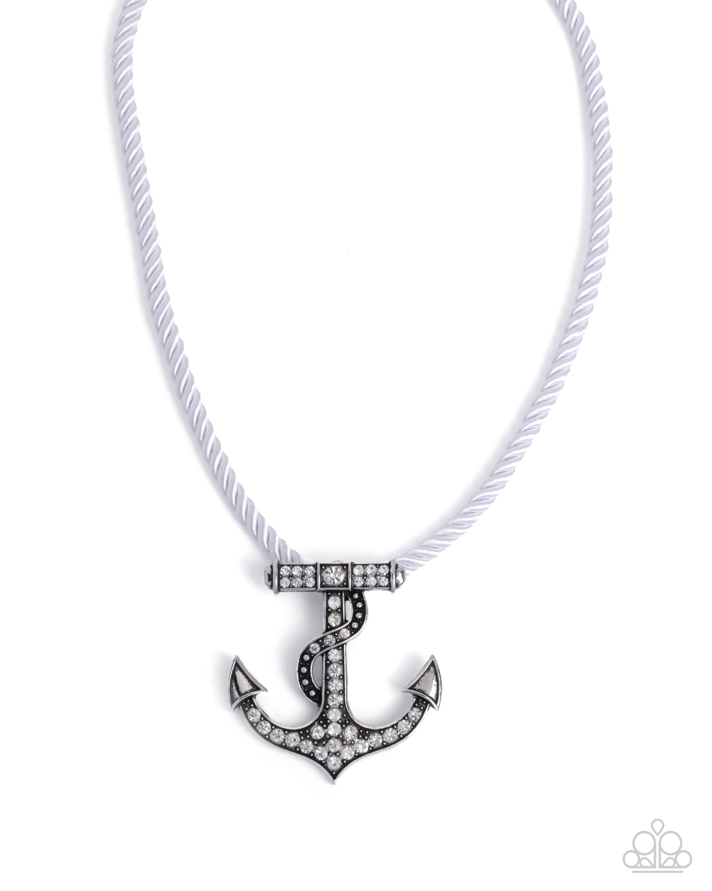 A nautical-inspired pendant featuring an antiqued silver anchor encrusted with dazzling white rhinestones is suspended from a twisted white cord for a striking contrast. Features an adjustable clasp closure.