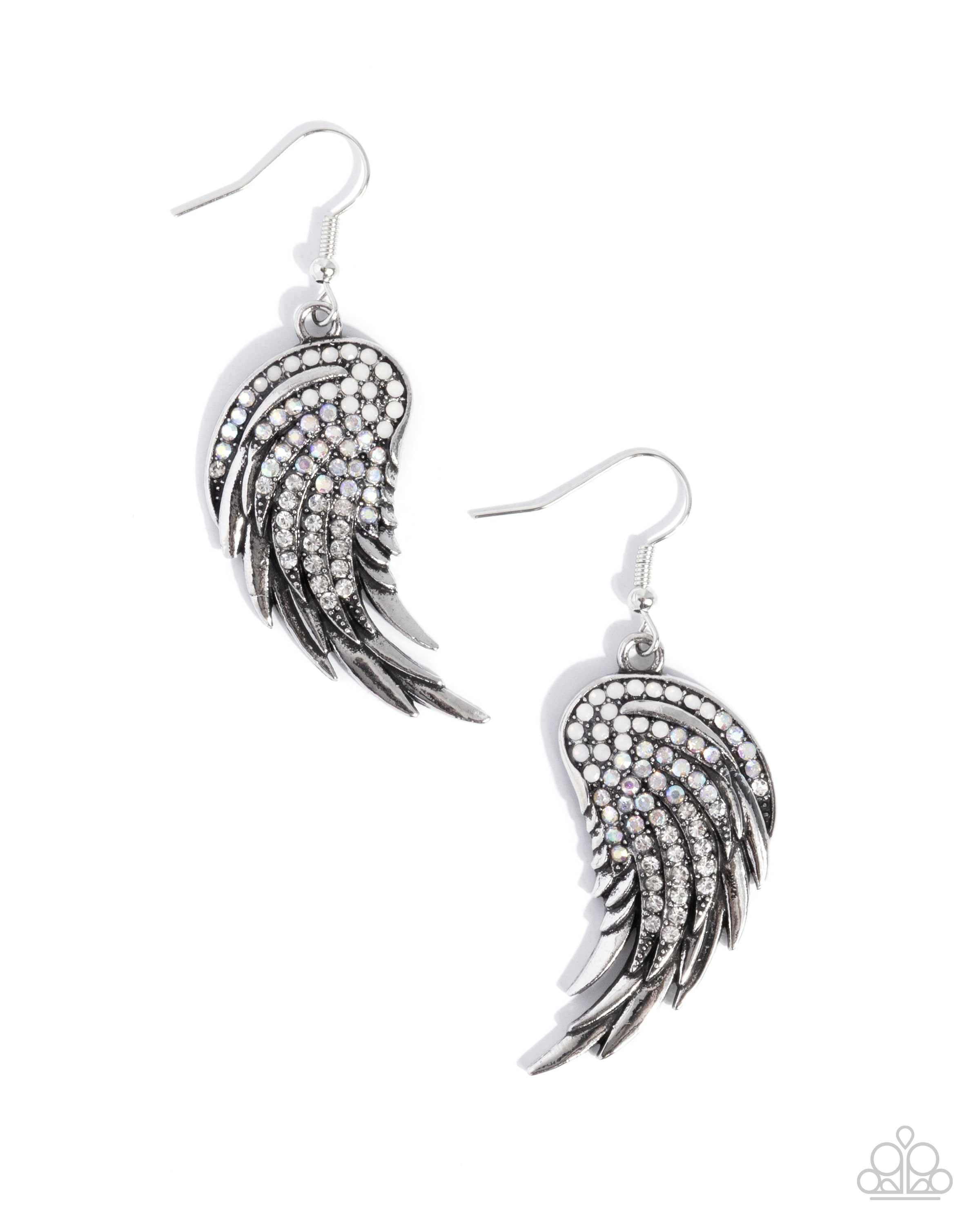 Dotted with row after row of white, iridescent, and opalescent rhinestones, a textured, silver half-angel wing cascades below the ear for a celestially chic display. Earring attaches to a standard fishhook fitting. Due to its prismatic palette, color may vary.