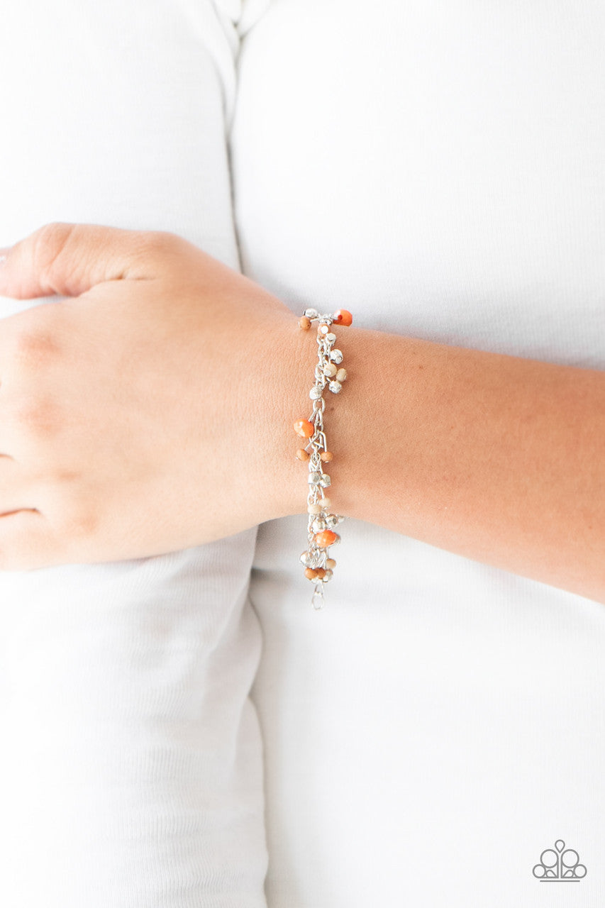 A variety of faceted orange, Almond Buff, and Meerkat beads swing from a shimmery silver chain, creating a flirtatious fringe around the wrist. Faceted silver beads trickle between the colorful beads, adding a hint of shimmer to the seasonal design. Features an adjustable clasp closure.
