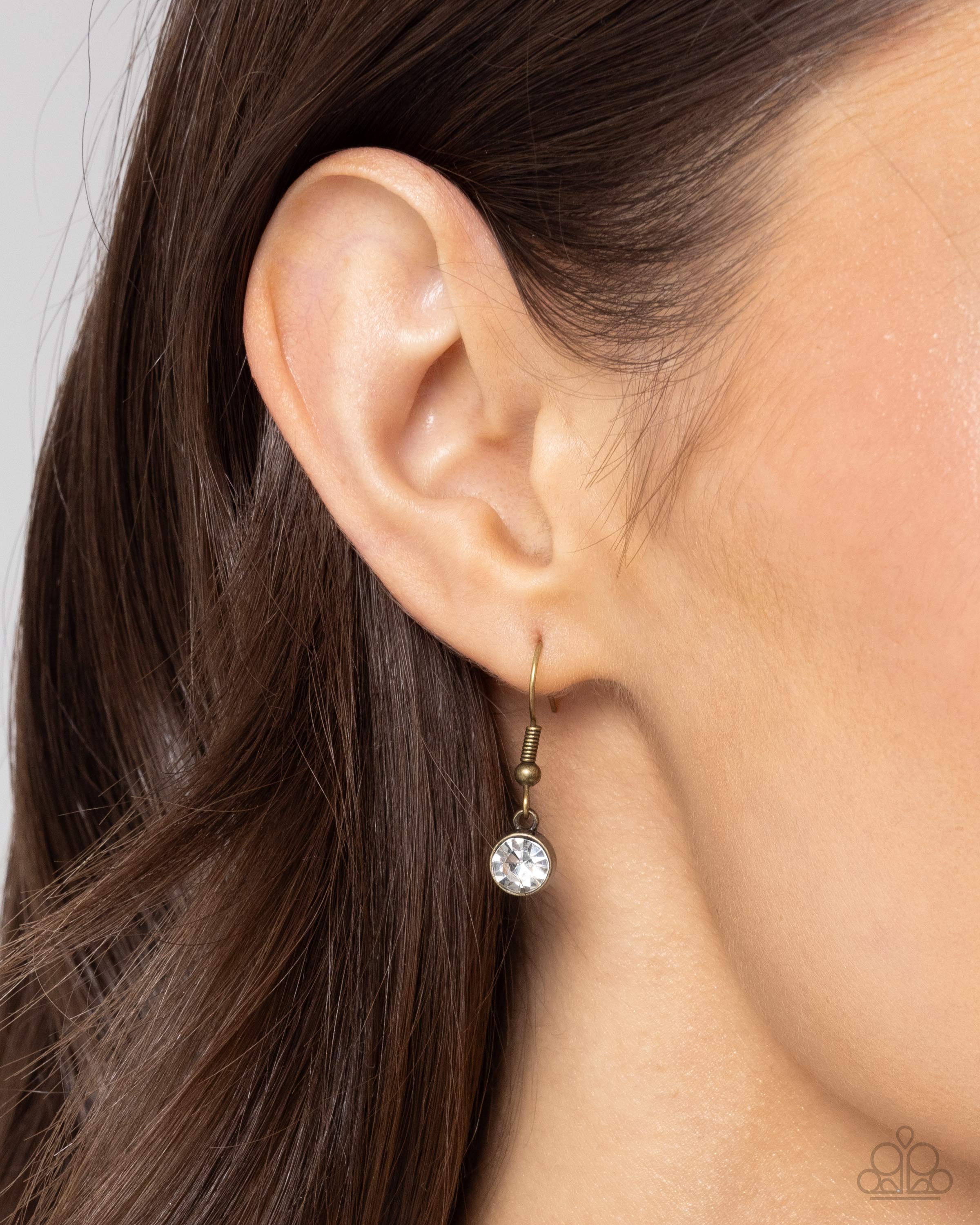 Connecting along a brass ring, a brass paperclip chain connects to an elongated, white rhinestone-encrusted solitaire brass paperclip link. A brass star, three-dimensional brass stars, brass discs, and a brass crescent moon sway and cascade from the brass hoop for an aesthetic astral look. Features an adjustable clasp closure.
