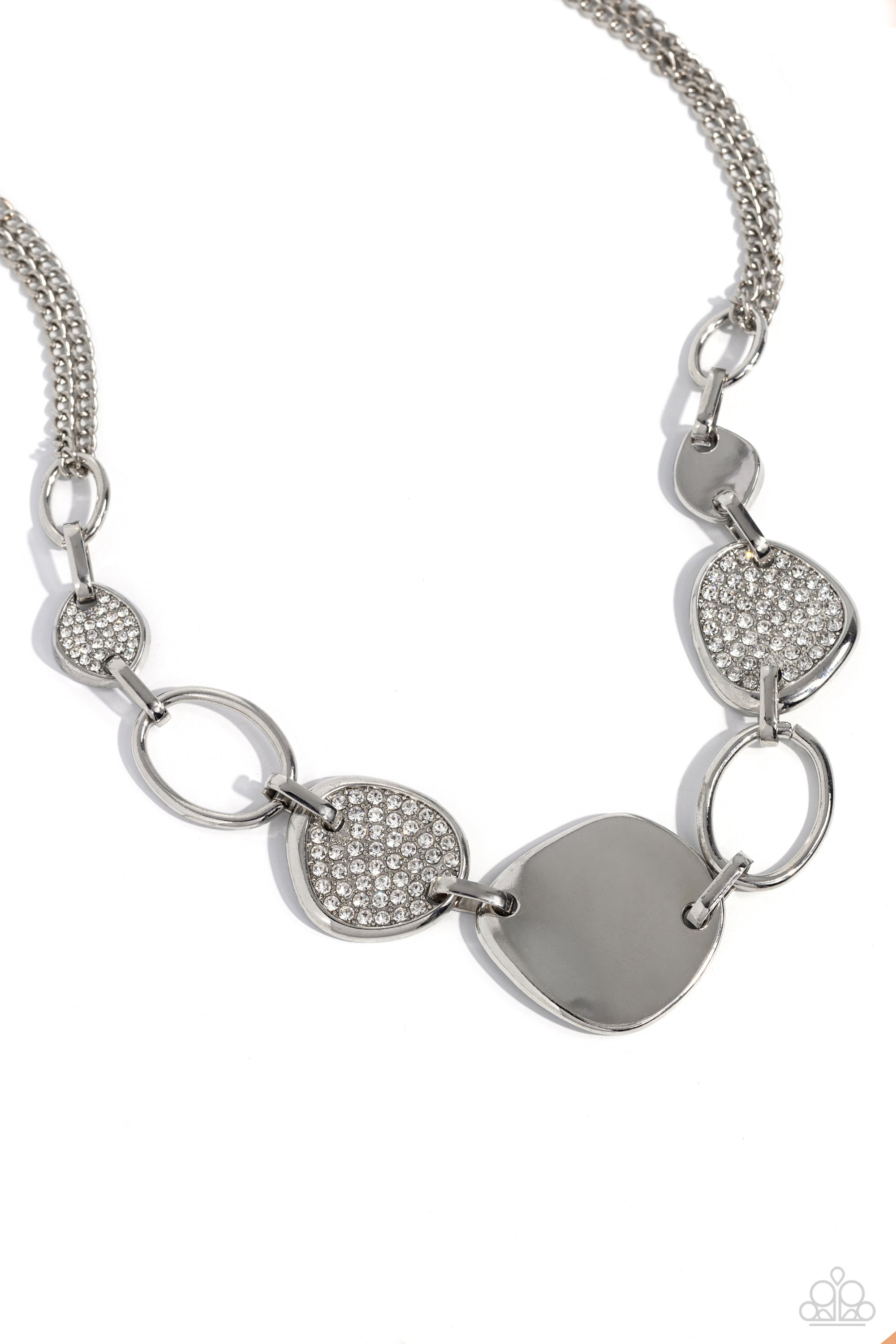 A shiny series of asymmetrical, concaved silver discs, some embossed in white rhinestones, alternate with airy silver frames as they delicately increase in size and link below the collar, creating an artisanal-inspired statement. Features an adjustable clasp closure.