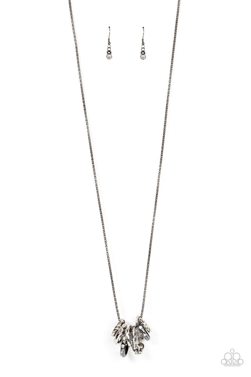 Featuring white rhinestones, faceted surfaces, twisted finishes, and chain-like patterns, an edgy collection of mismatched silver and gunmetal rings glide along a lengthened gunmetal popcorn chain in a glamorously gritty finish. Features an adjustable clasp closure.