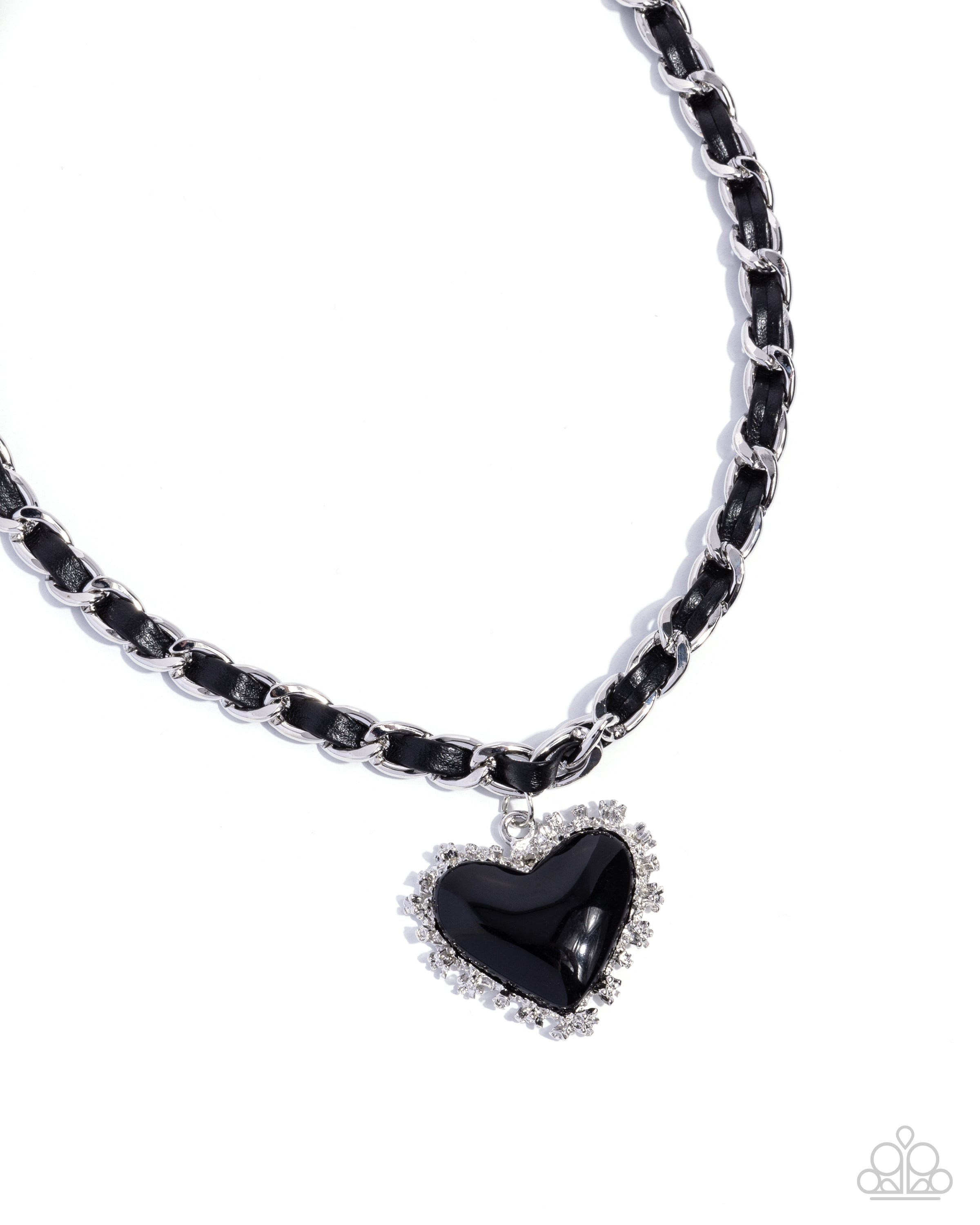 Woven through a silver curb chain, a high-sheen black leather ribbon loops below the neckline for a tastefully grungy display. A black heart acrylic swings from the colorful display bordered in silver studded detail for additional eye-catching color and sheen. Features an adjustable clasp closure.