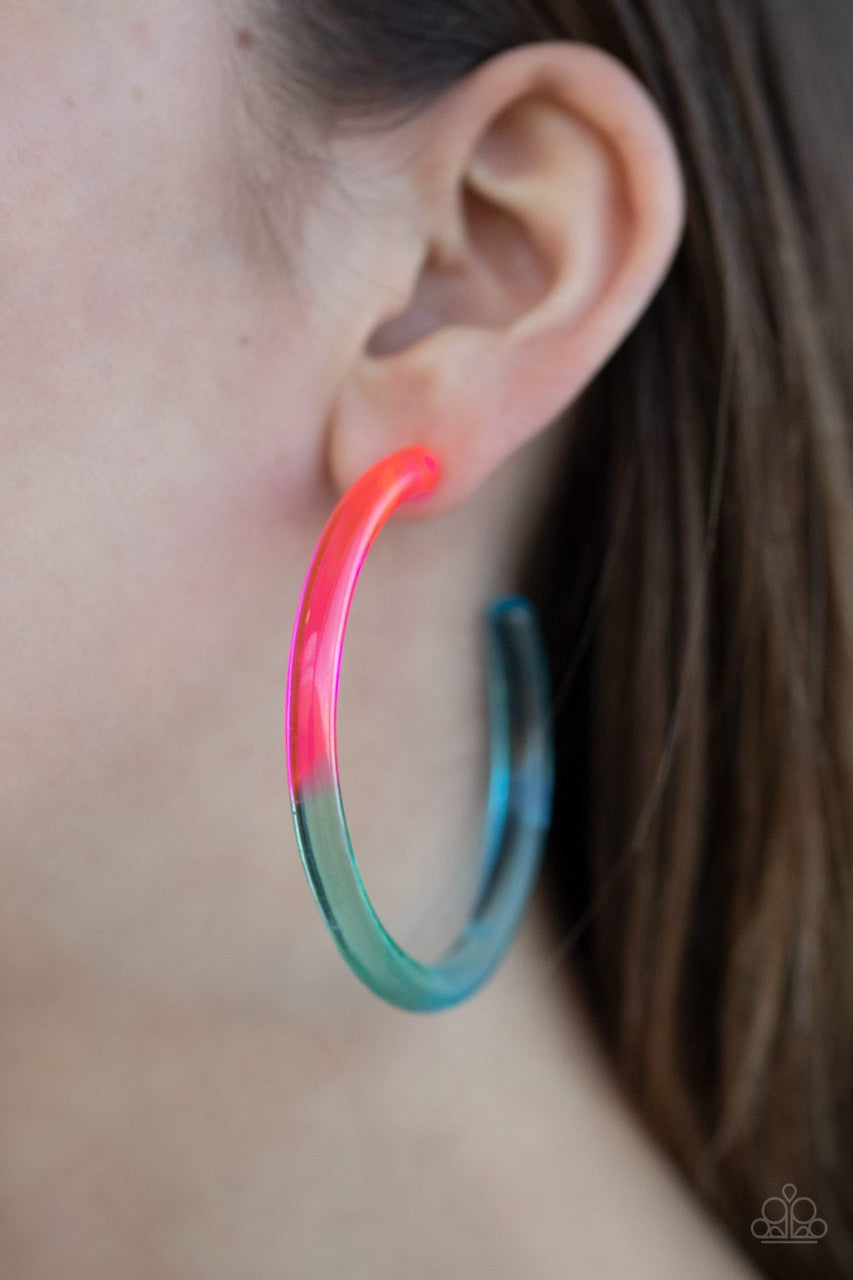A colorful acrylic hoop fades from pink to green to blue for a retro inspired look. Earring attaches to a standard post fitting. Hoop measures approximately 2 1/4" in diameter.