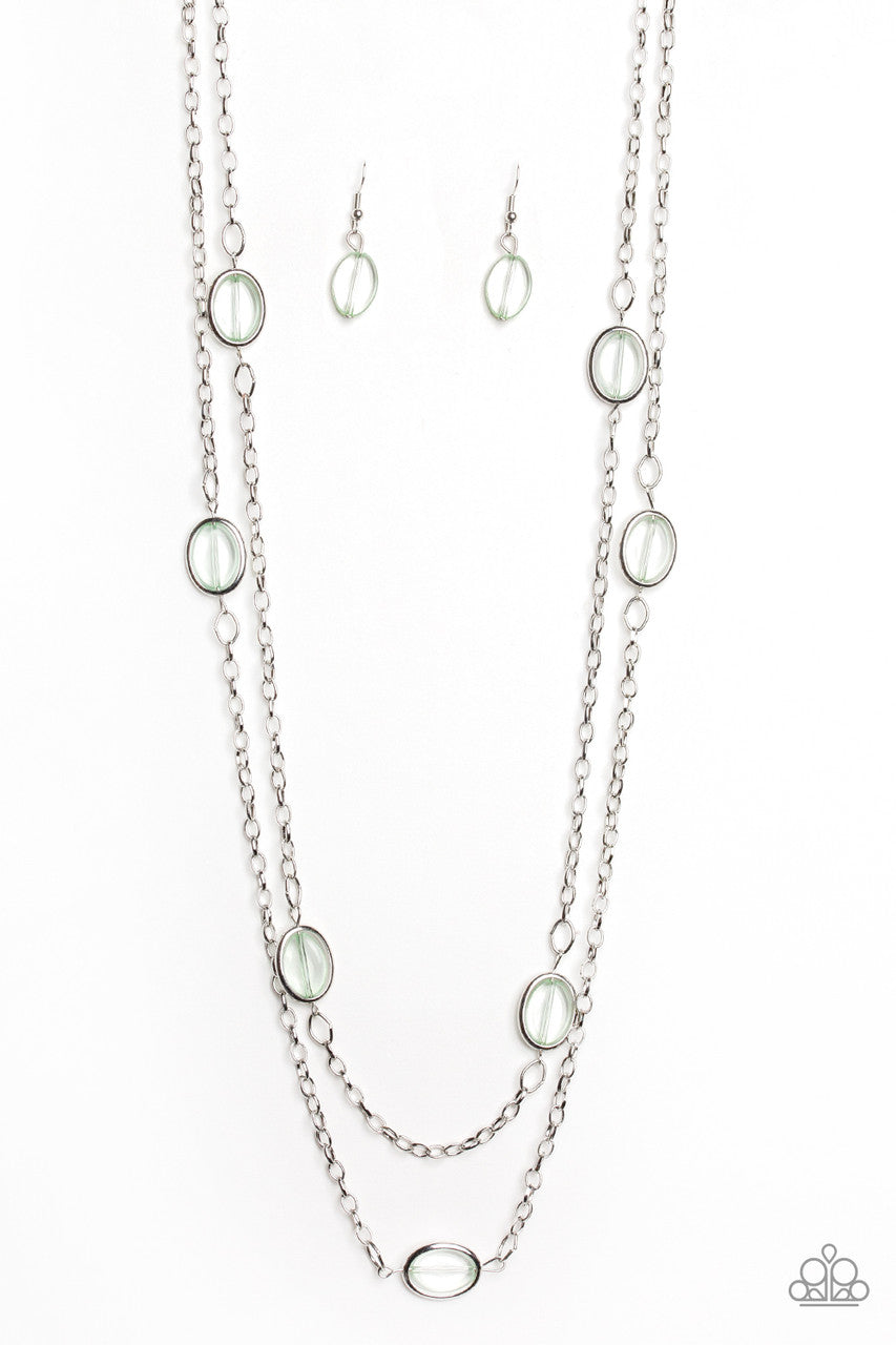 Glassy green beads are threaded along metallic rods, allowing them to spin inside their silver fittings. The colorful frames trickle along two shimmery chains across the chest for a refined layered look. Features an adjustable clasp closure.