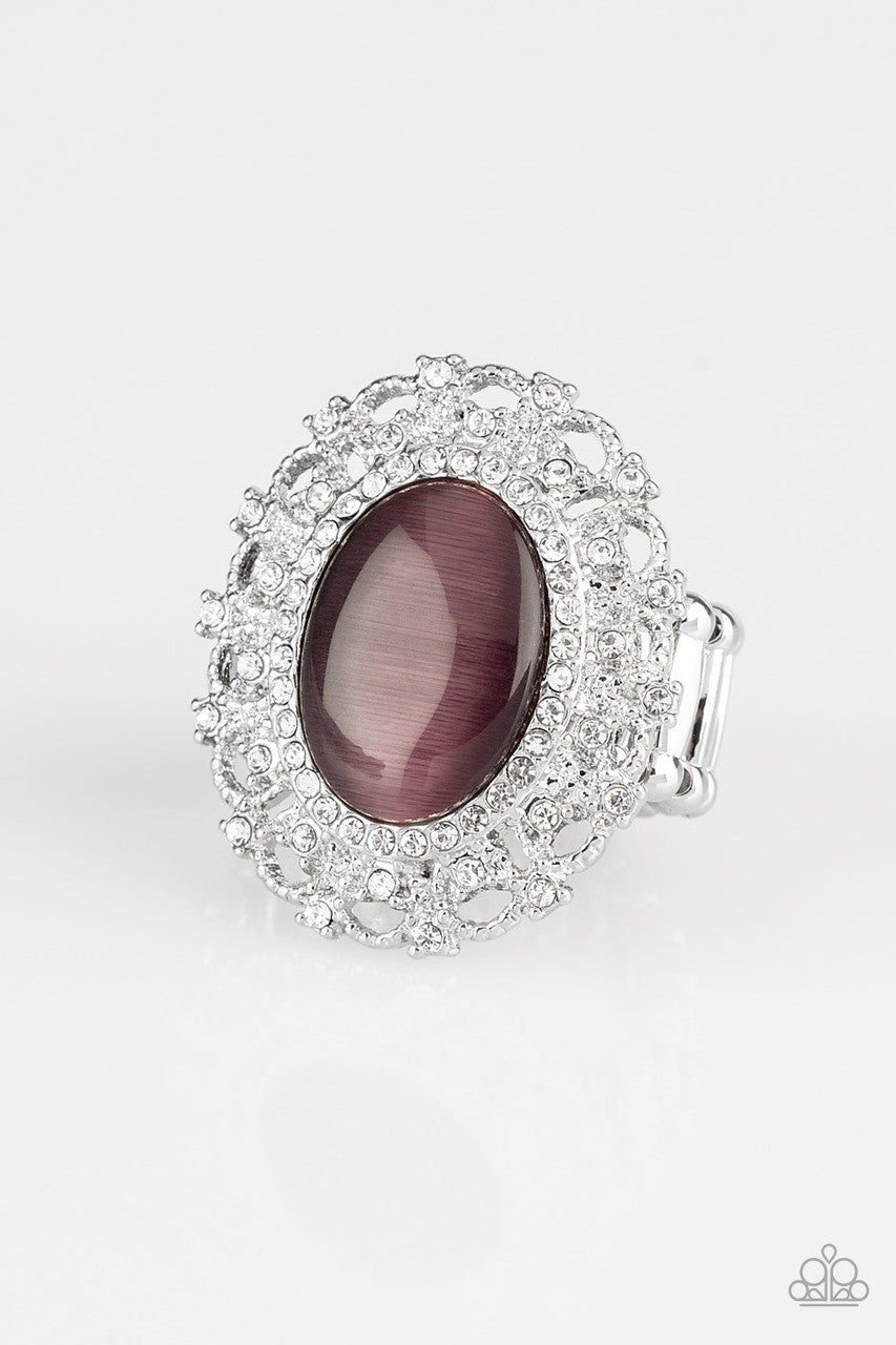 Encrusted in dainty white rhinestones, a frilly silver frame spins around a glowing purple moonstone center for a regal look. Features a stretchy band for a flexible fit.