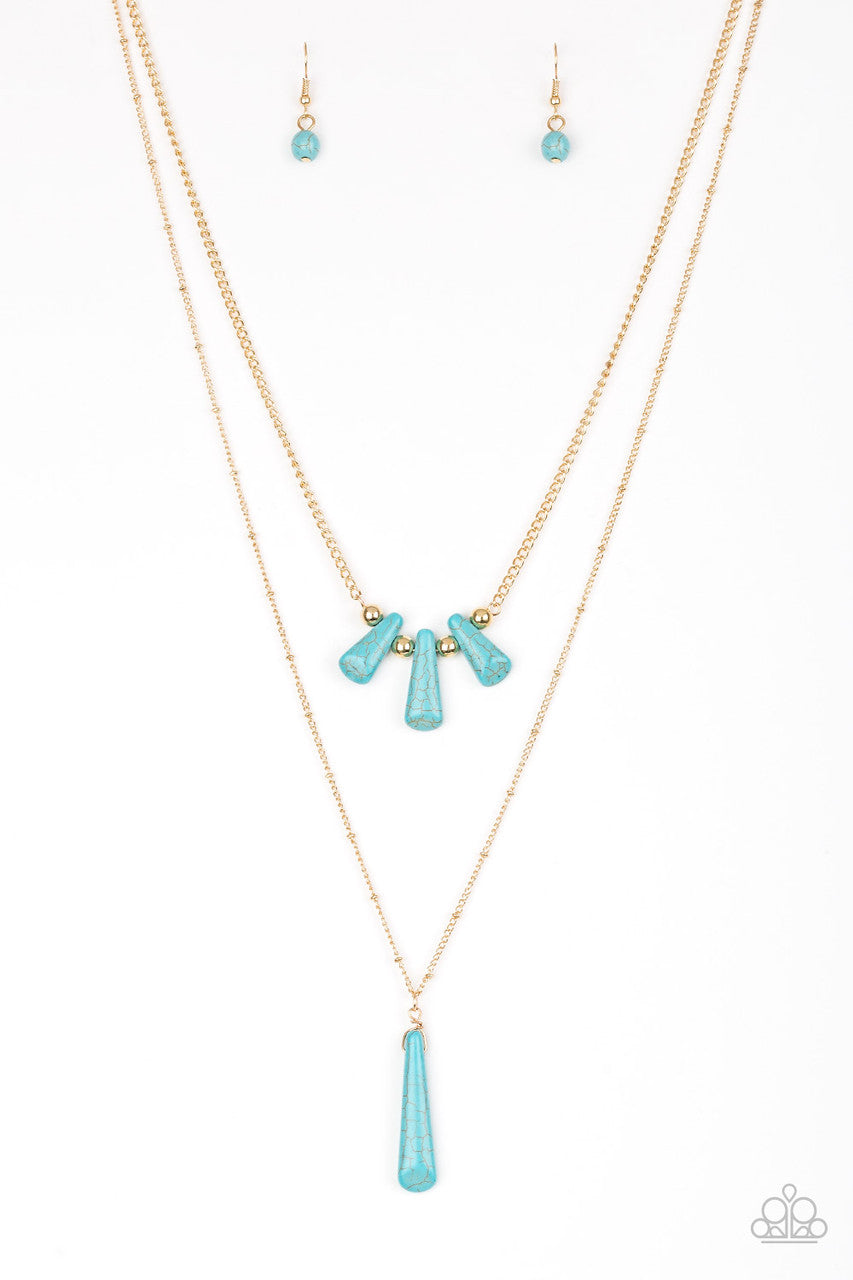 Chiseled into flared teardrop shapes, a dainty fringe of turquoise stones and golden beads gives way to a large stone pendant, creating earthy layers down the chest. Features an adjustable clasp closure.