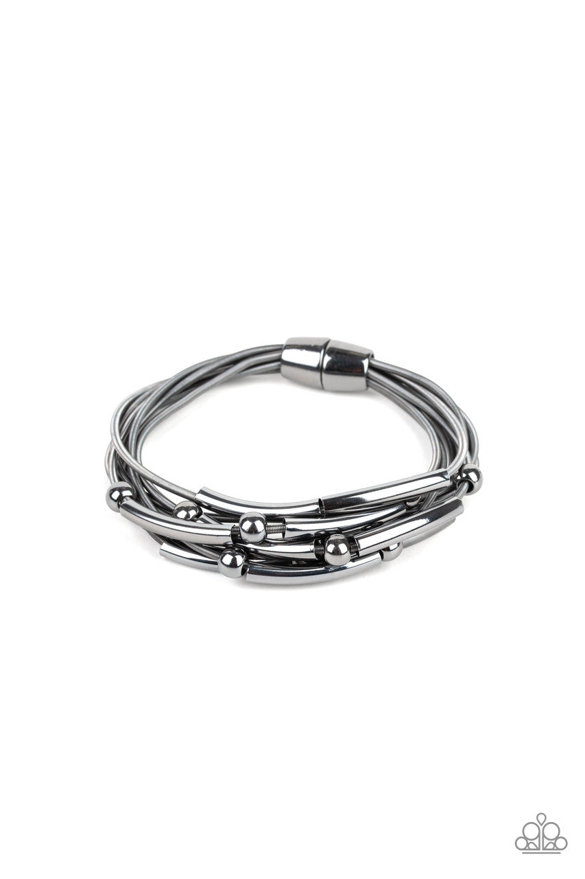 A collection of gunmetal beads and gunmetal accents slides along gunmetal spring-like bracelets, creating stretchy layers around the wrist. Features a magnetic closure.
