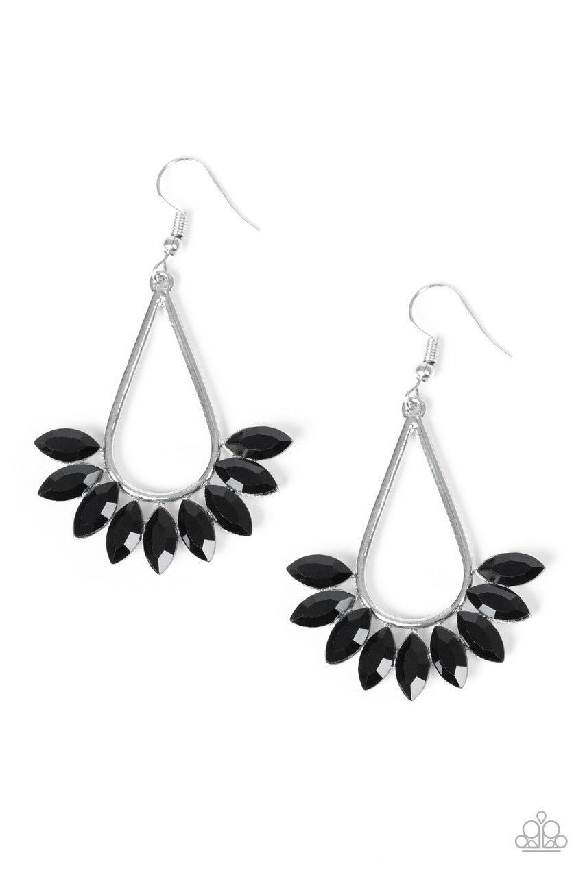 Marquise cut black rhinestones fan from the bottom of a glistening silver teardrop, creating an edgy fringe. Earring attaches to a standard fishhook fitting.