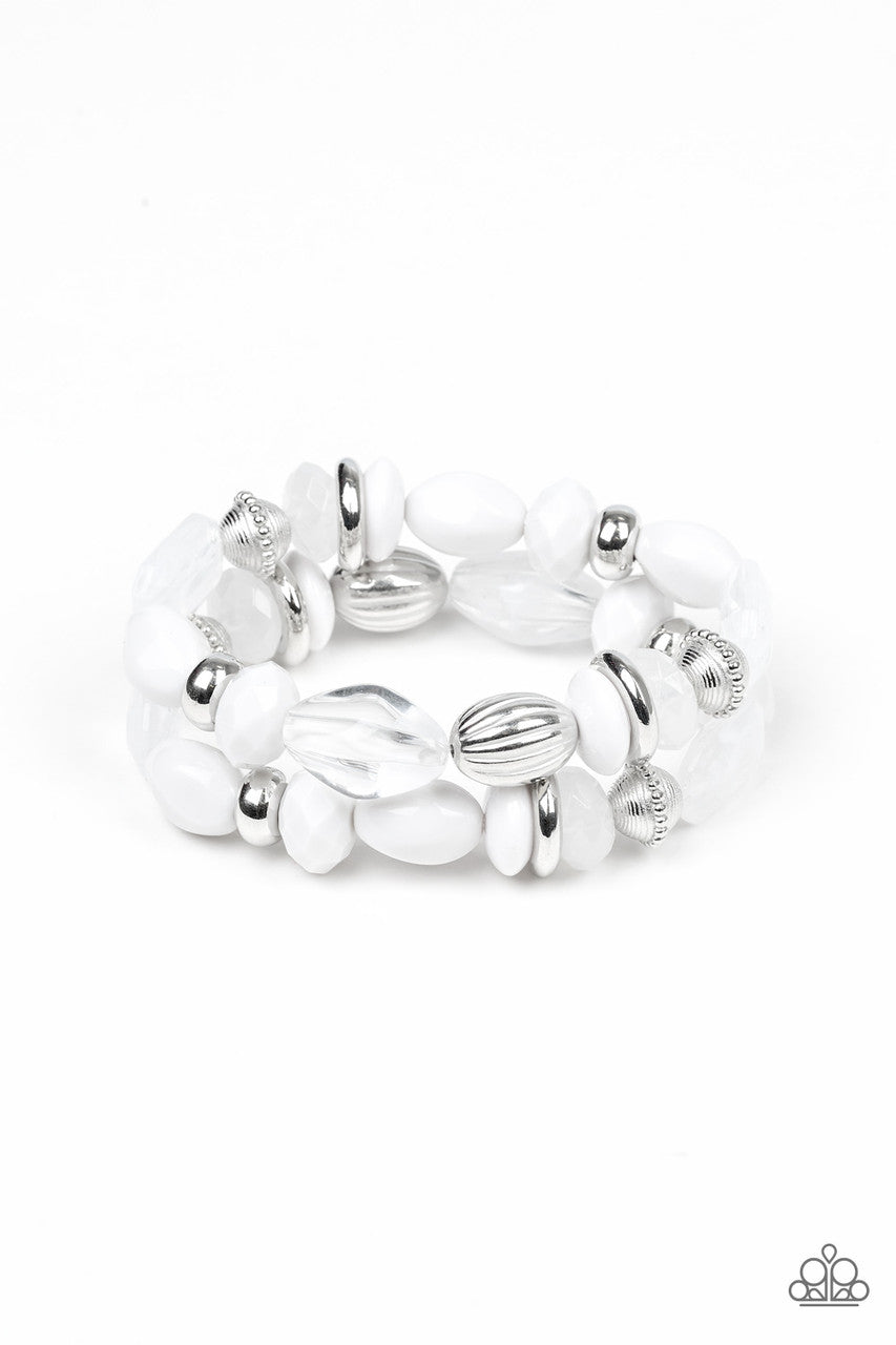 An assortment of opaque, polished white, and shimmery silver beads are threaded along stretchy bands around the wrist, creating colorful layers.