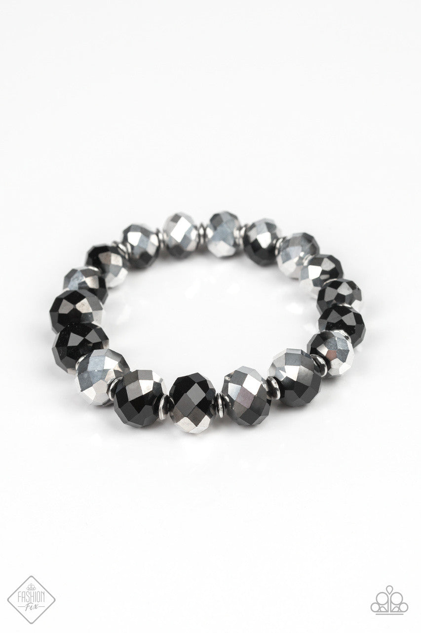 Faceted hematite and black crystal-like gems are threaded along a stretchy band, gradually increasing in size near the center for a dramatic finish.