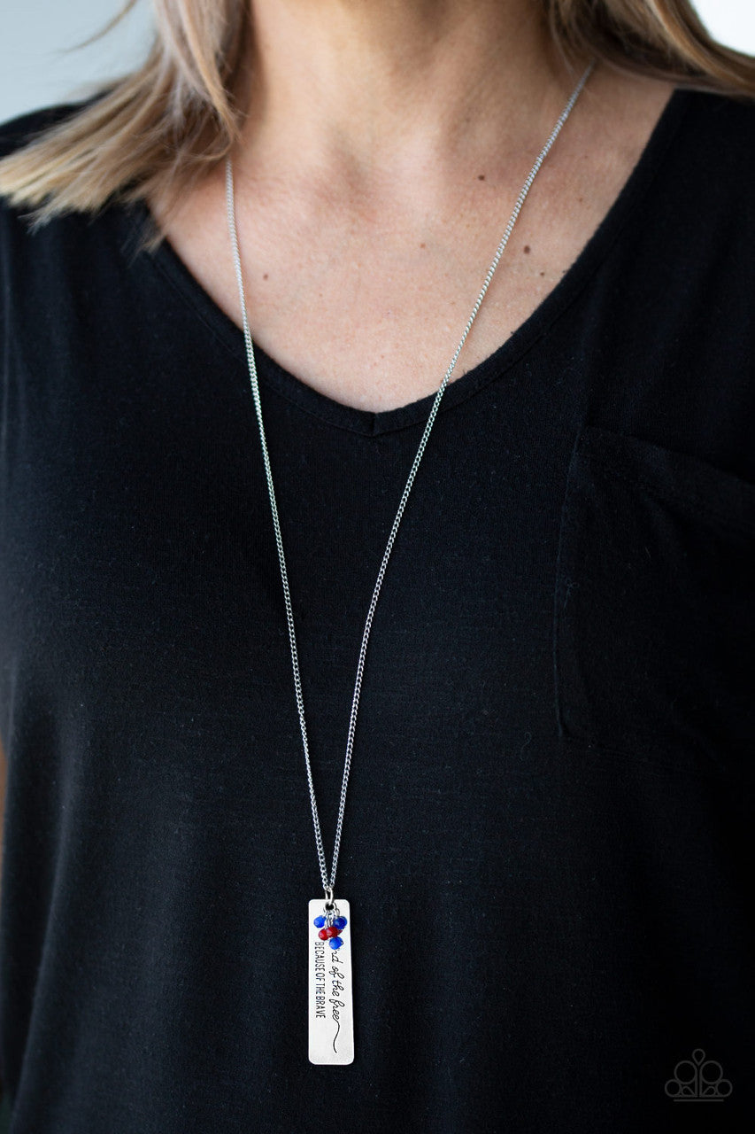 Infused with a cluster of dainty blue and red cat's eye beads, a silver plate is stamped in the phrase, "Land Of The Free Because Of The Brave", for a whimsical finish. Features an adjustable clasp closure.