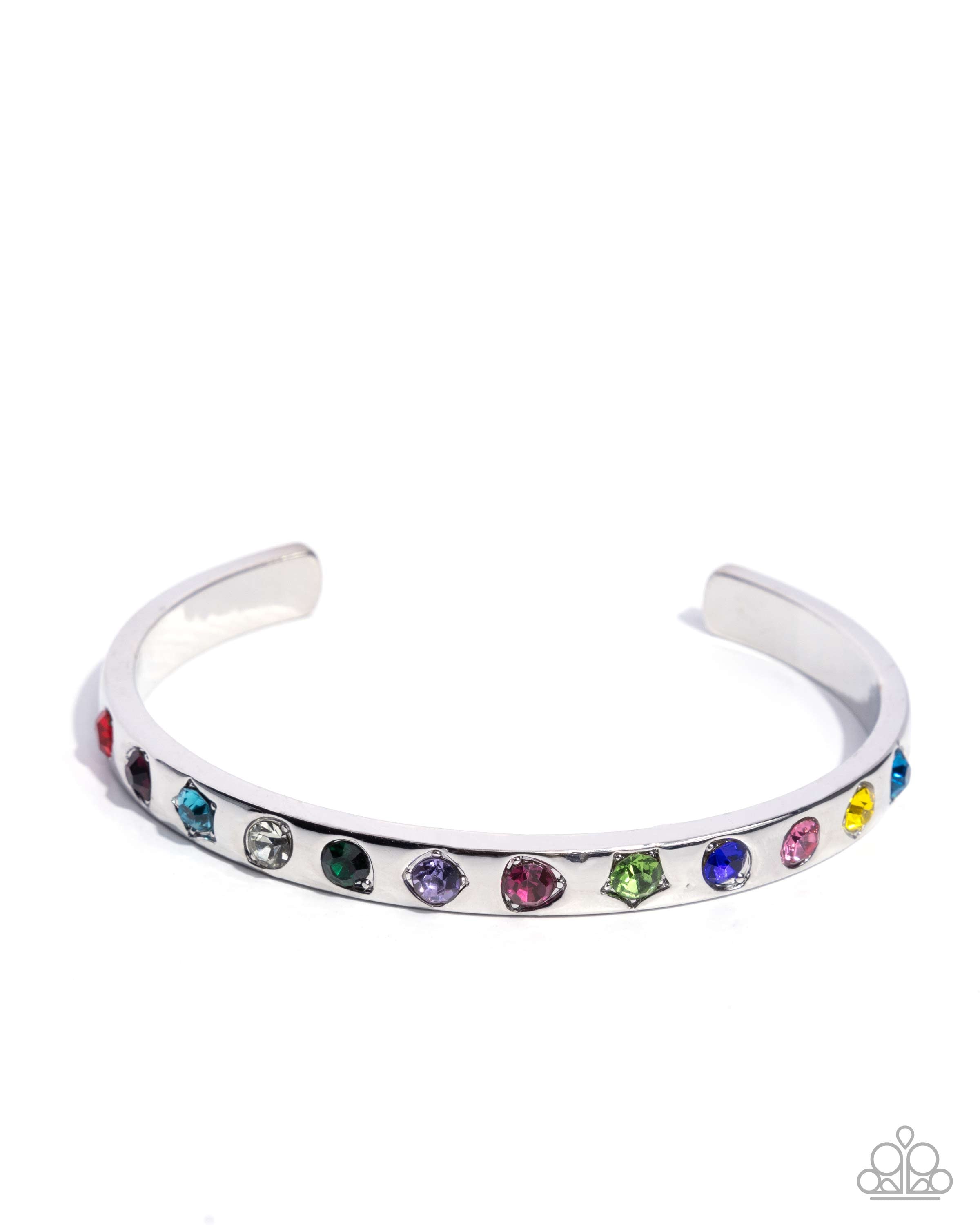 Embedded along the front of a dainty silver cuff, a collection of multicolored gems in round, teardrop, and star settings glistens atop the wrist for a brilliant display of bling.