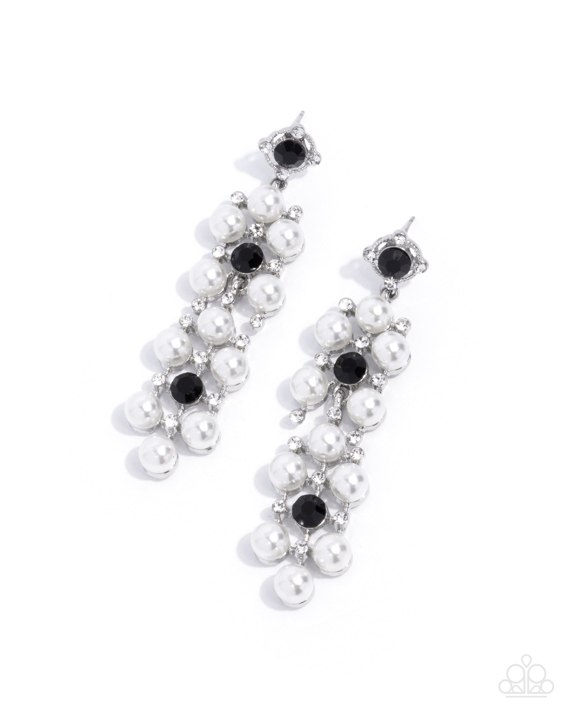 Pressed in an airy, textured rhinestone-dotted silver frame, a black gem glistens from the ear, giving way to a collection of white rhinestones, white pearls, and black gems for a luminescent ladylike display. Earring attaches to a standard post fitting.