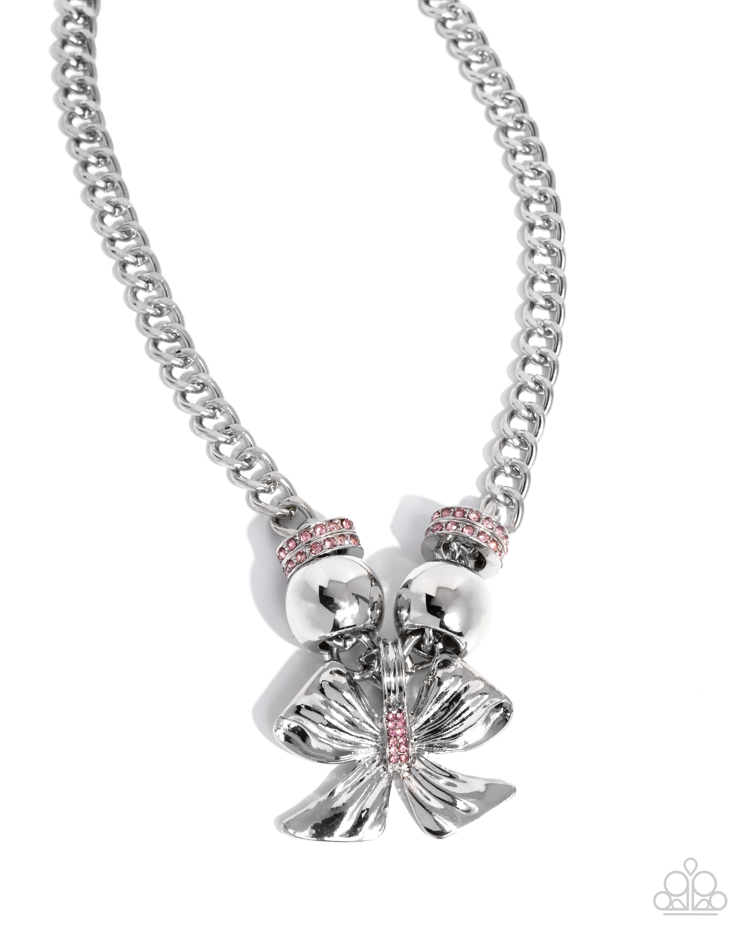 Infused along a glistening silver curb chain, a duo of silver discs dusted in light rose rhinestones and large silver beads lead the eye to a crimped, oversized silver bow below the neckline for a dazzling dignified display. Rows of dainty light rose rhinestones dot along the middle of the bow for additional radiance. Features an adjustable clasp closure.