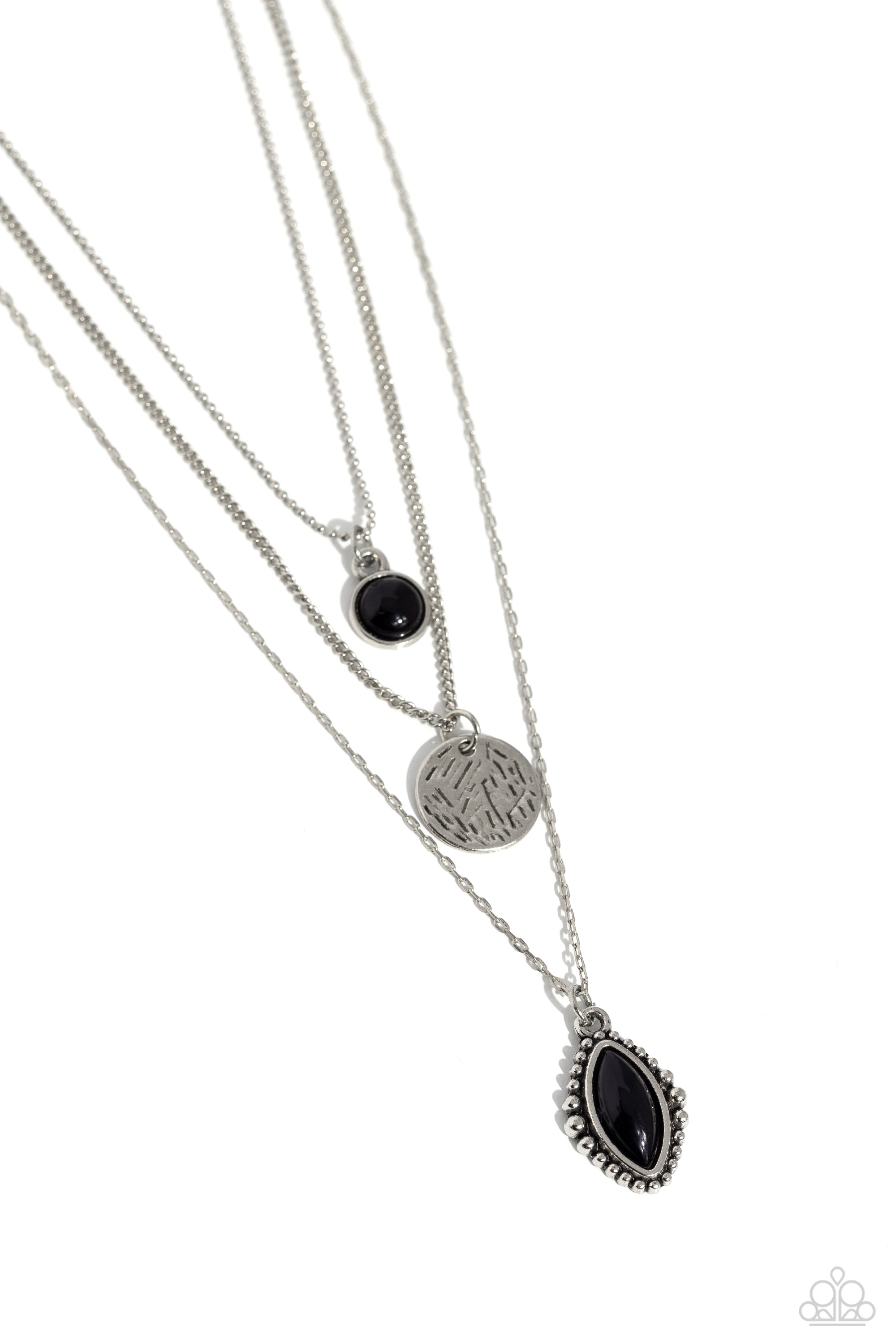 Three mismatched silver chains layer below the collar. A round black bead swings from the uppermost chain, above a scratched silver disc, and marquise-shaped black bead for a colorfully layered look. Features an adjustable clasp closure.