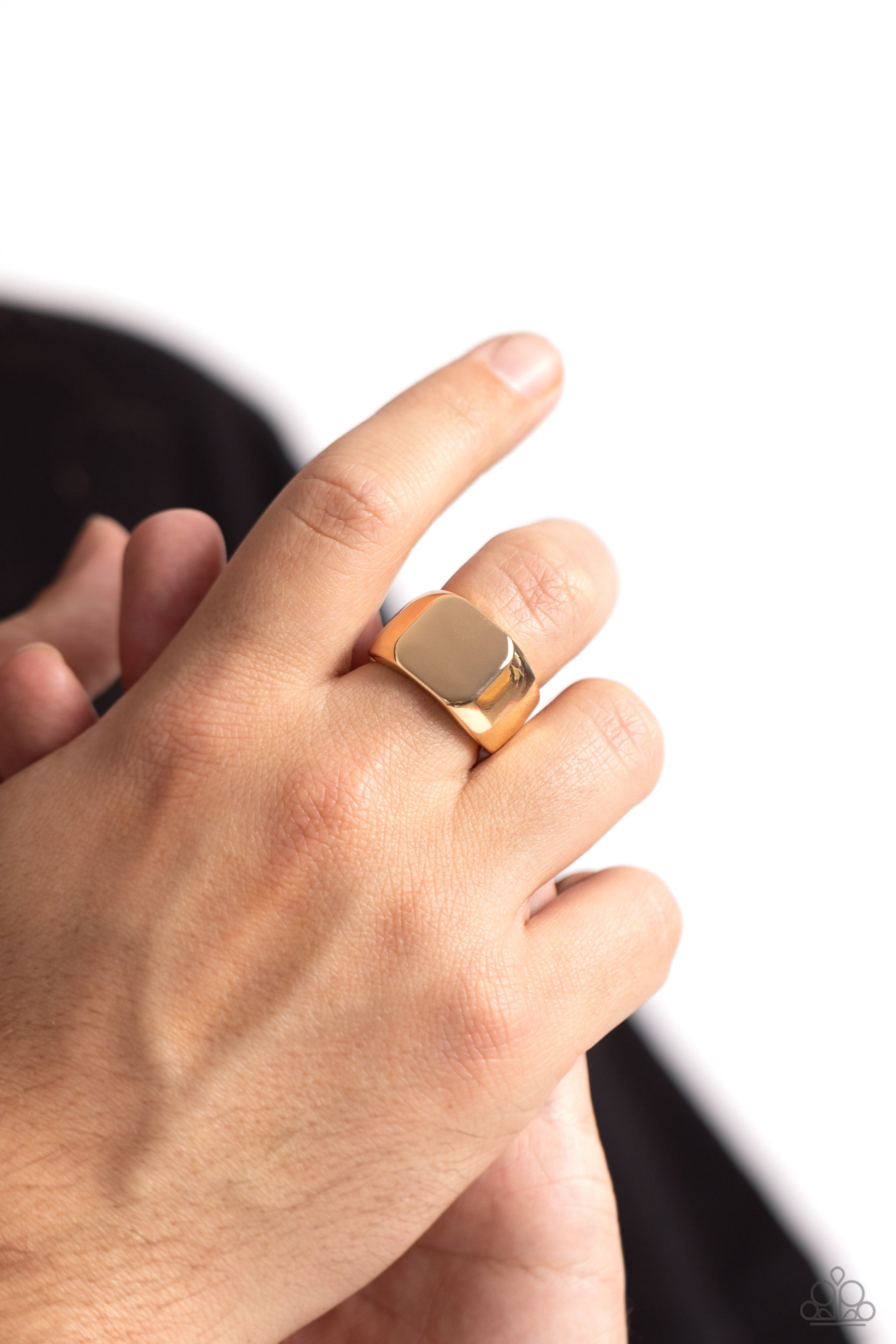 The center of a thick gold band has been smashed into a flat cube center for a casual look. Features a stretchy band for a flexible fit.