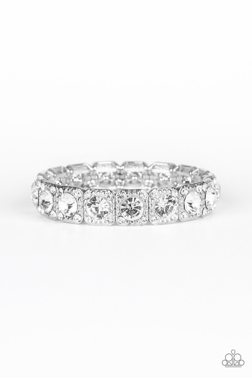 Featuring oversized white rhinestone centers, studded silver frames radiating in glassy white rhinestones are threaded along a stretchy band around the wrist for a glamorous fashion.