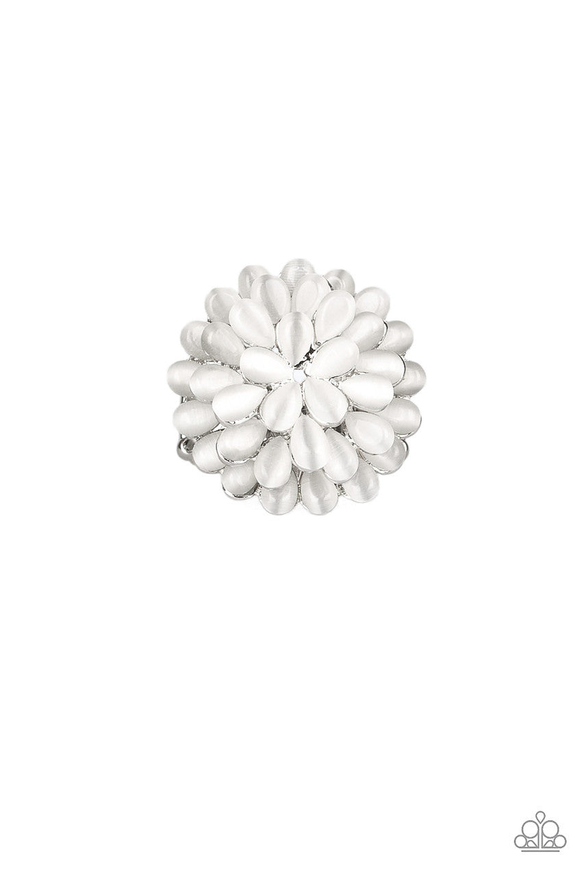 Row after row of teardrop cat's eye stones stack into a blast of white petals atop the finger, creating a whimsical blossom. Features a stretchy band for a flexible fit.