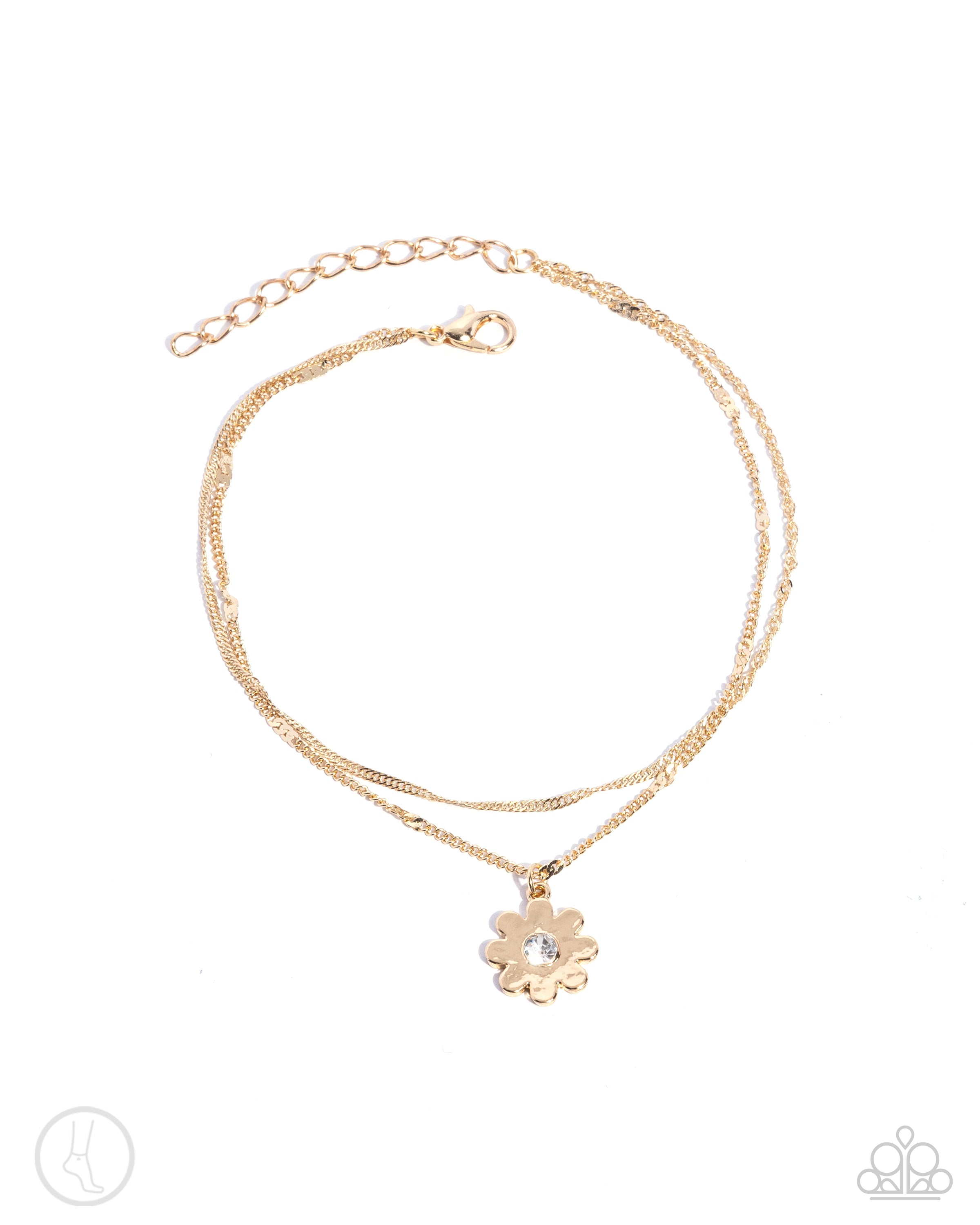 Featuring a white rhinestone center, a whimsical gold flower charm glides along a dainty gold chain while an additional dainty gold chain completes the layered look around the anklet. Features an adjustable clasp closure.