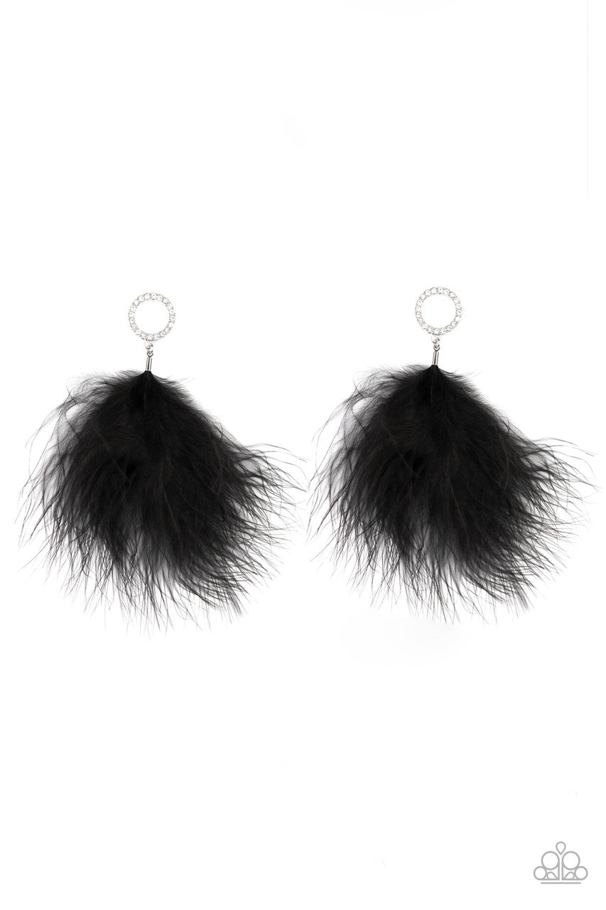 A fuzzy black feather swings from the bottom of a white rhinestone encrusted silver ring, creating a refined lure. Earring attaches to a standard post fitting.