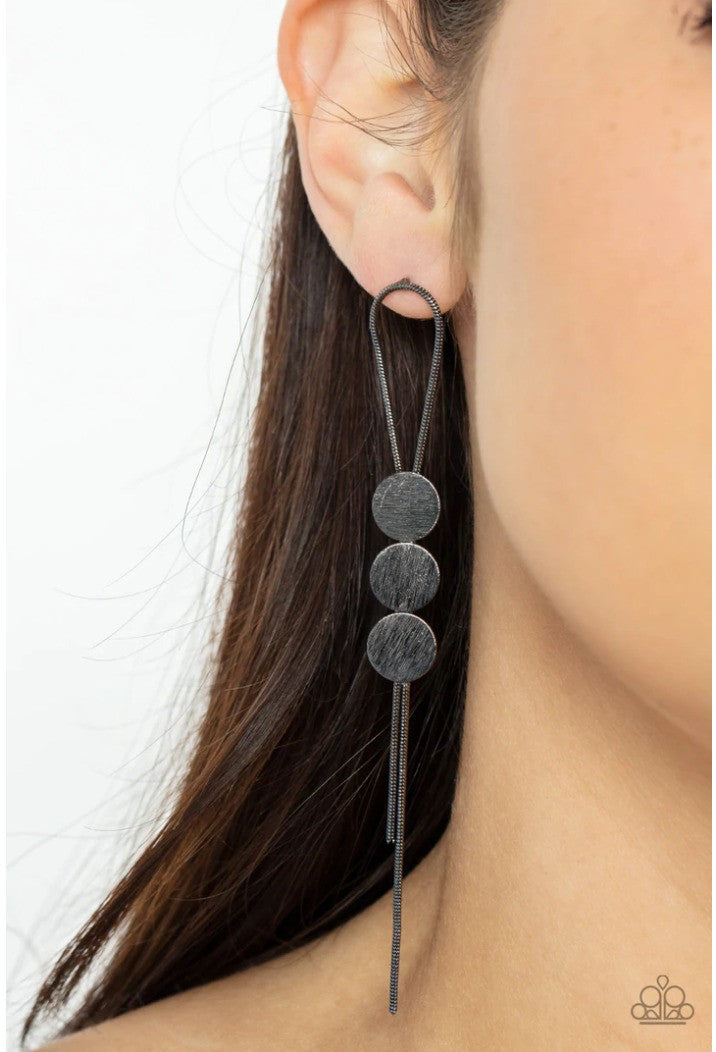 A gunmetal loop of round snake chain is held in place by a trio of scratched gunmetal discs, creating a trendy bolo-like lure. Earring attaches to a standard post fitting.