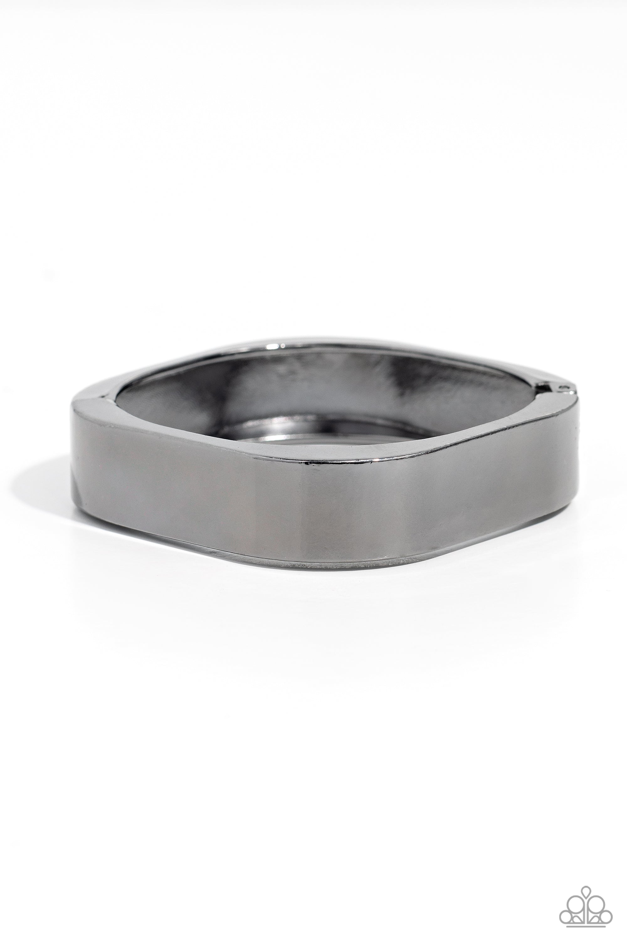 Featuring a sleek, high-sheen finish, a thick gunmetal cuff asymmetrically wraps around the wrist, creating a tilted square centerpiece for a monochromatic staple. Features a hinged closure.