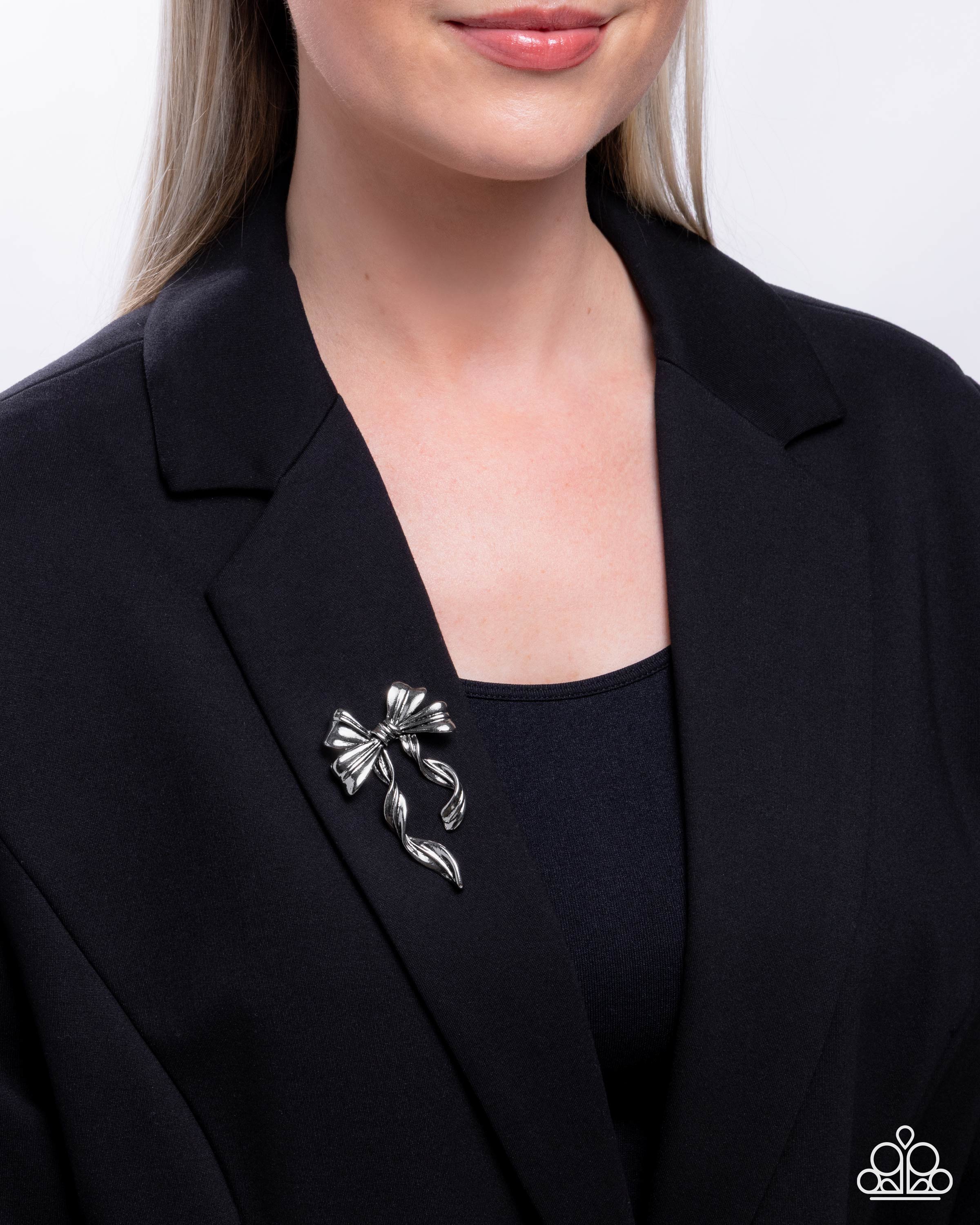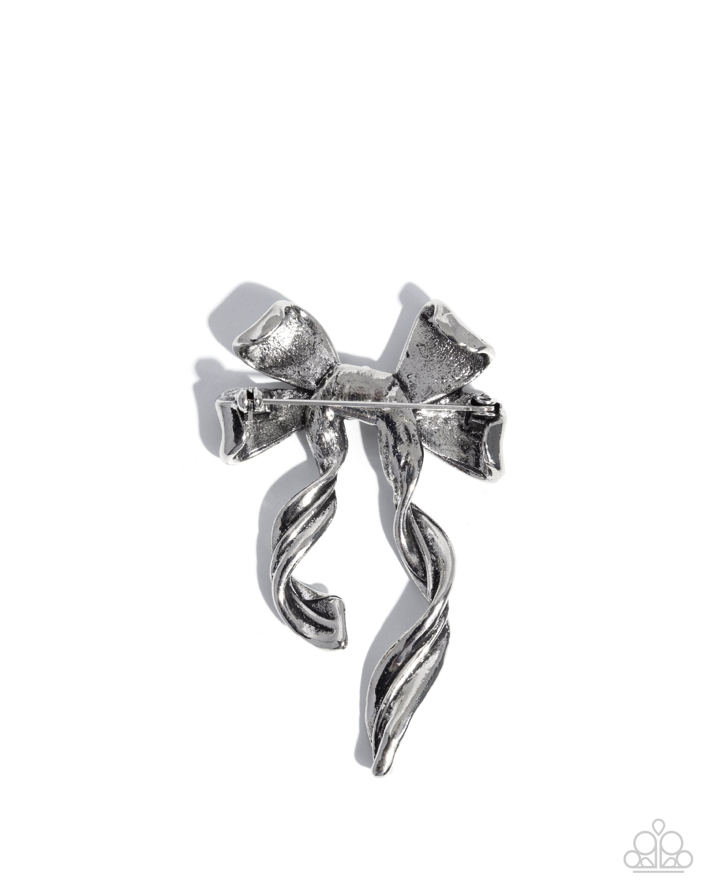 Featuring a high sheen, glistening silver ribbons curl and tie into a radiantly refined bow centerpiece. Brooch measures approximately 2 3/4" in length and 1 1/2" in width.
