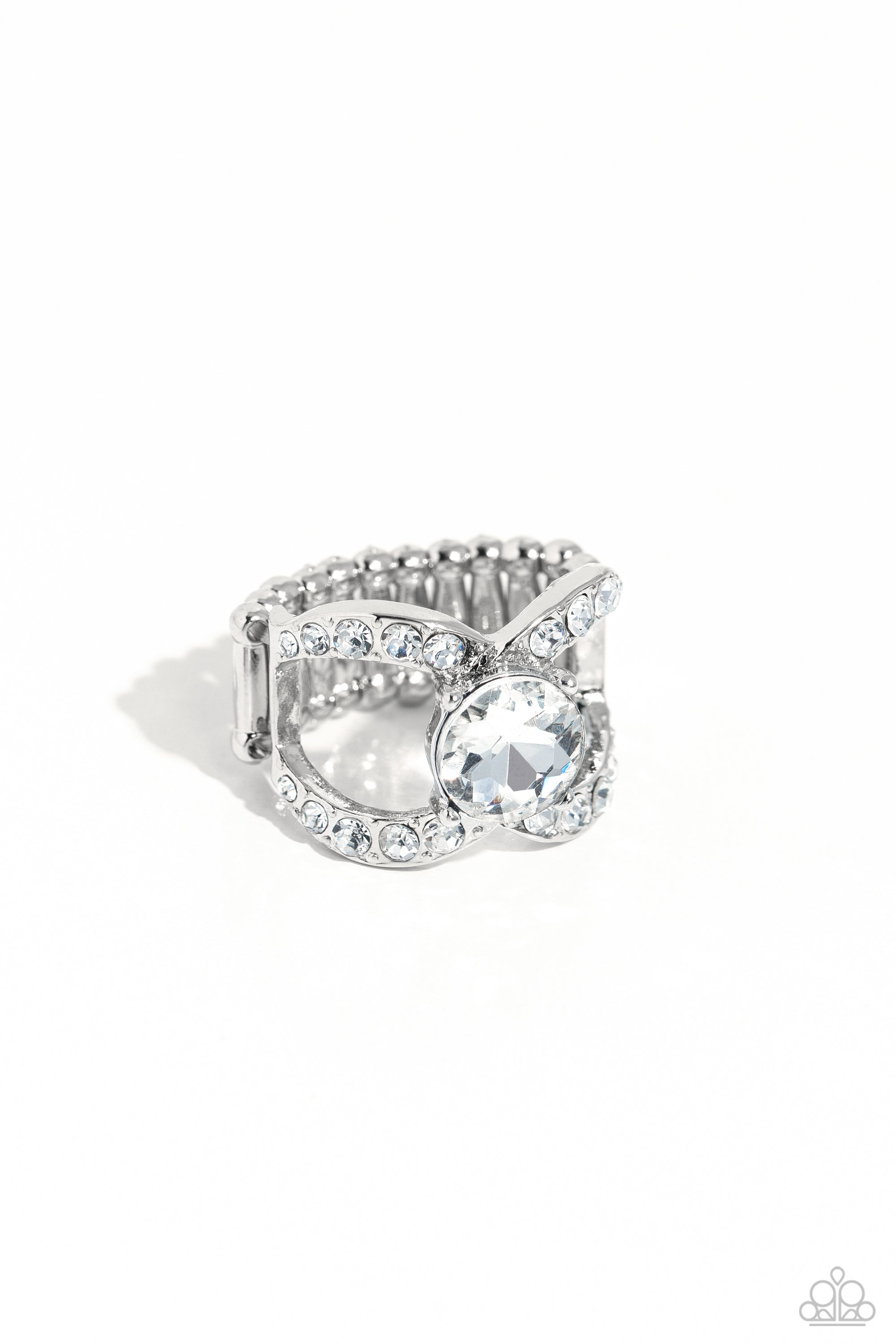 Encircling a pronged, white gem, shimmery silver bars dusted in white gems sweep across the finger, gathering into a silver bow-like frame for a radiant finish. Features a stretchy band for a flexible fit.