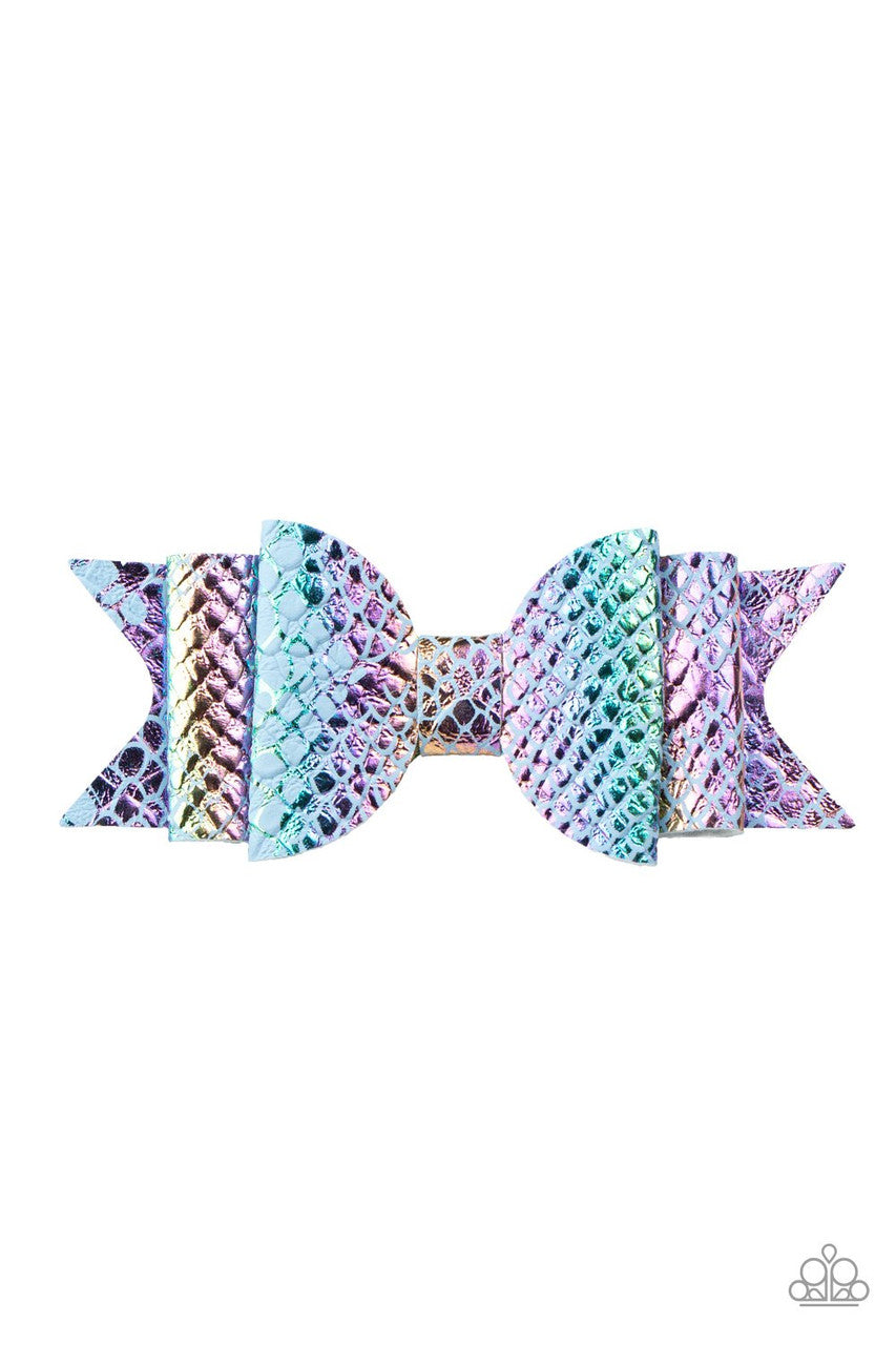 Featuring a rainbow scale pattern, an iridescent piece of leather delicately knots into a mermaid inspired bow. Features a standard hair clip.